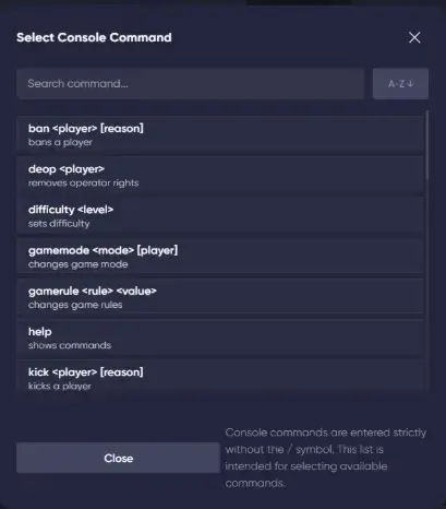 This feature allows users to execute server commands through a built-in command selector without manually typing them or remembering syntax. Available commands are displayed in a searchable list with short descriptions, reducing errors and speeding up server management. Commands can be selected and executed directly from the console, without support assistance.