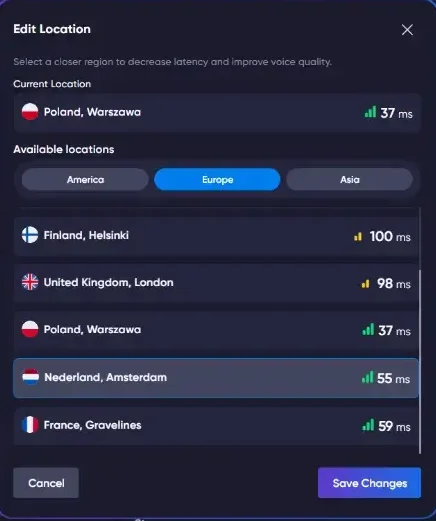 Low-latency regions listed in-panel:USA East, USA West, Canada, Great Britain (UK), Netherlands, Ukraine, Finland, Germany, Poland, Singapore, India, Australia.