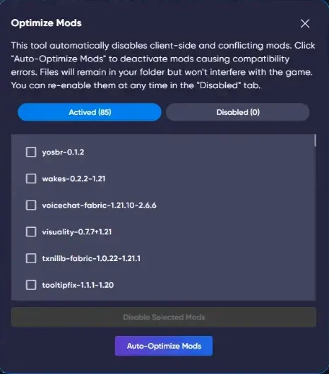 This feature allows users to by itself detect and disable client-side and conflicting mods directly from the New Control Panel, without contacting support. The system automatically identifies incompatible mods and can disable them in one click using Auto-Optimize Mods. Disabled mods remain in the folder and can be re-enabled at any time, helping to quickly resolve crashes and compatibility issues.