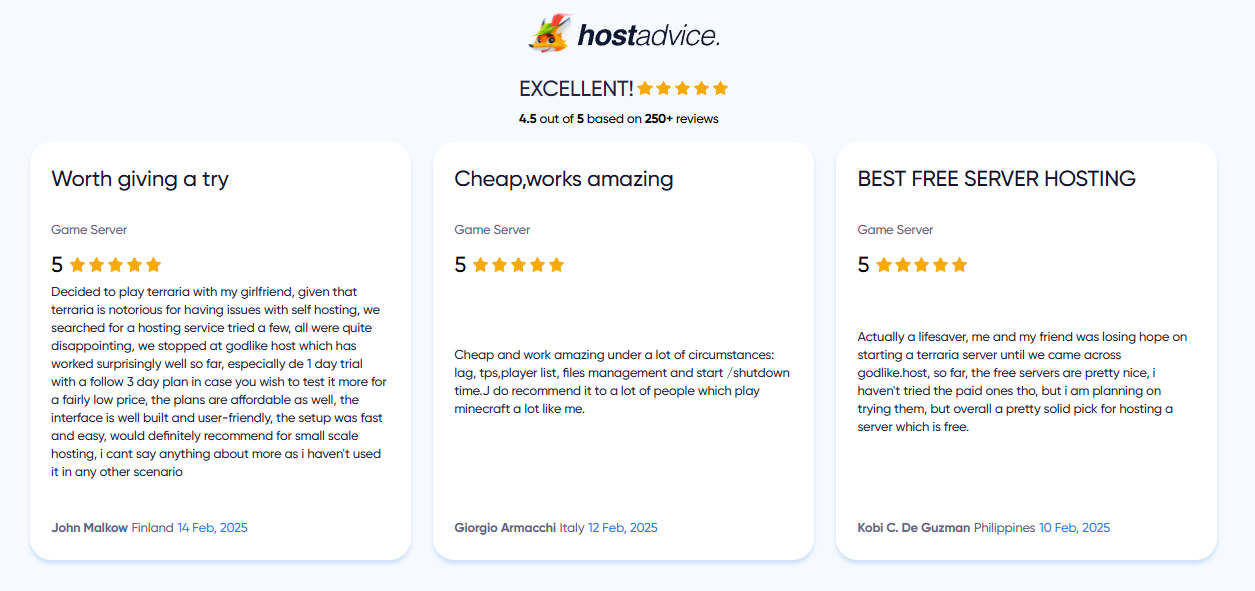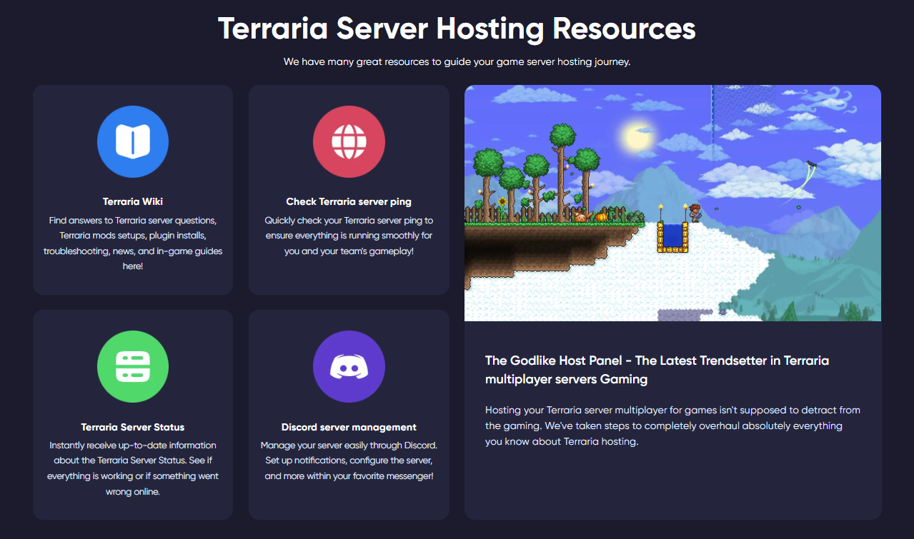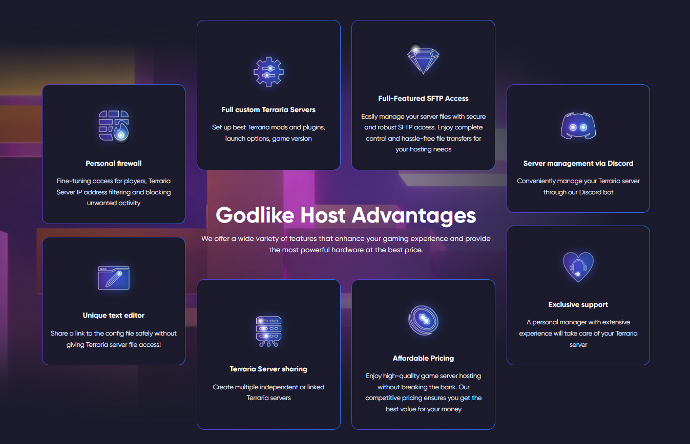 Godlike.host tops our Terraria server hosting list because it delivers the “no-drama” basics that matter most: high-clock CPU, NVMe RAM/disk combos sized for Terraria players, a tidy control panel with true server settings, and free DDoS protection (always-on DDoS protection) so public worlds don’t wobble during peak hours. Instant setup means you can create a Terraria server, load your world, and play with friends fast. Power users get SFTP, console, and role-based permissions; newcomers get simple toggles for backups, mods, and difficulty. Good price tiers, good tooling, and a support team that actually answers easy to recommend.
