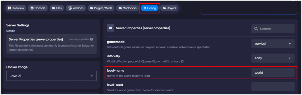 By default, this value is set to world. Replace it with the exact name of your uploaded world folder. Example:
