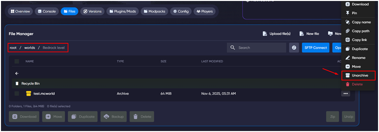 Step 3: After uploading your world, return to the Godlike Panel, open the Files tab, and navigate to root / worlds /. Find your uploaded .mcworld file, click the three dots, and select Unarchive to extract it. Make sure the world files (level.dat, db, etc.) appear directly inside the folder and not within another subfolder.