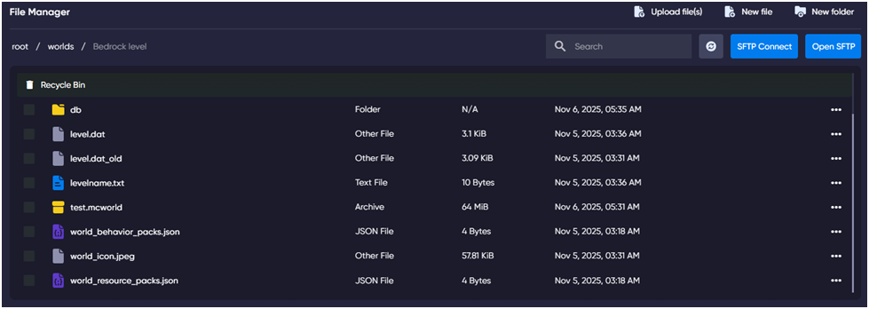 Step 1: You can upload your Bedrock world by opening the Files section in the Godlike Panel or by connecting to your server via SFTP.