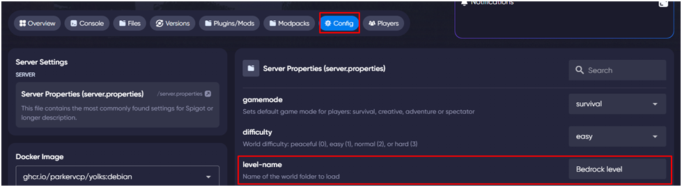 By default, this value is set to Bedrock level. Replace it with the exact name of your uploaded world folder. Example: