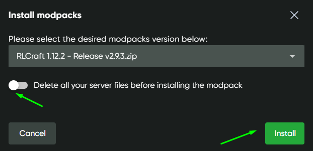 Se volete ricominciare da capo, attivate la casella di controllo "Cancella tutti i file del server" Questo sovrascriverà i vecchi file e installerà correttamente il modpack. Si consiglia di attivarla per la prima installazione o per la reinstallazione completa.