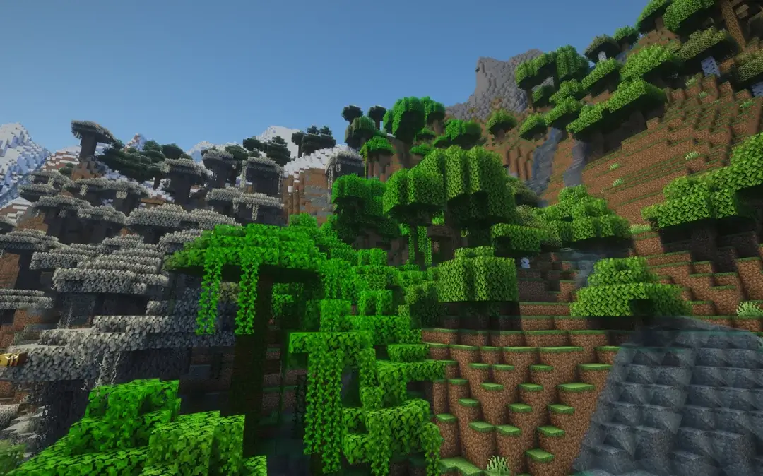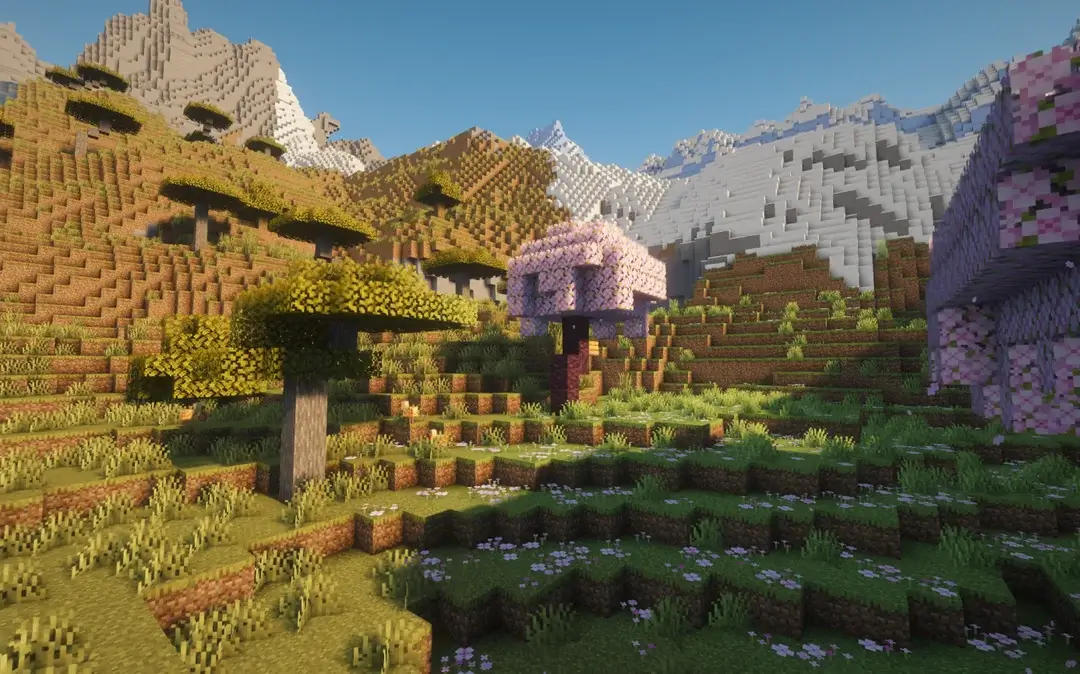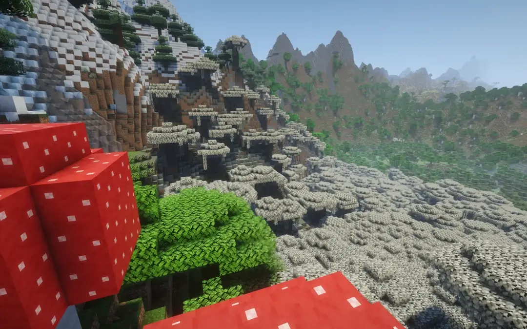 You spawn inside the mountain ring. Wood types are oak, spruce, birch, jungle, dark oak, acacia, bamboo, cherry, and pale oak. Only mangrove is missing because it is incompatible with mountains.