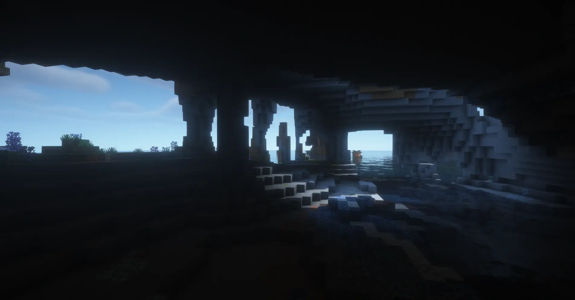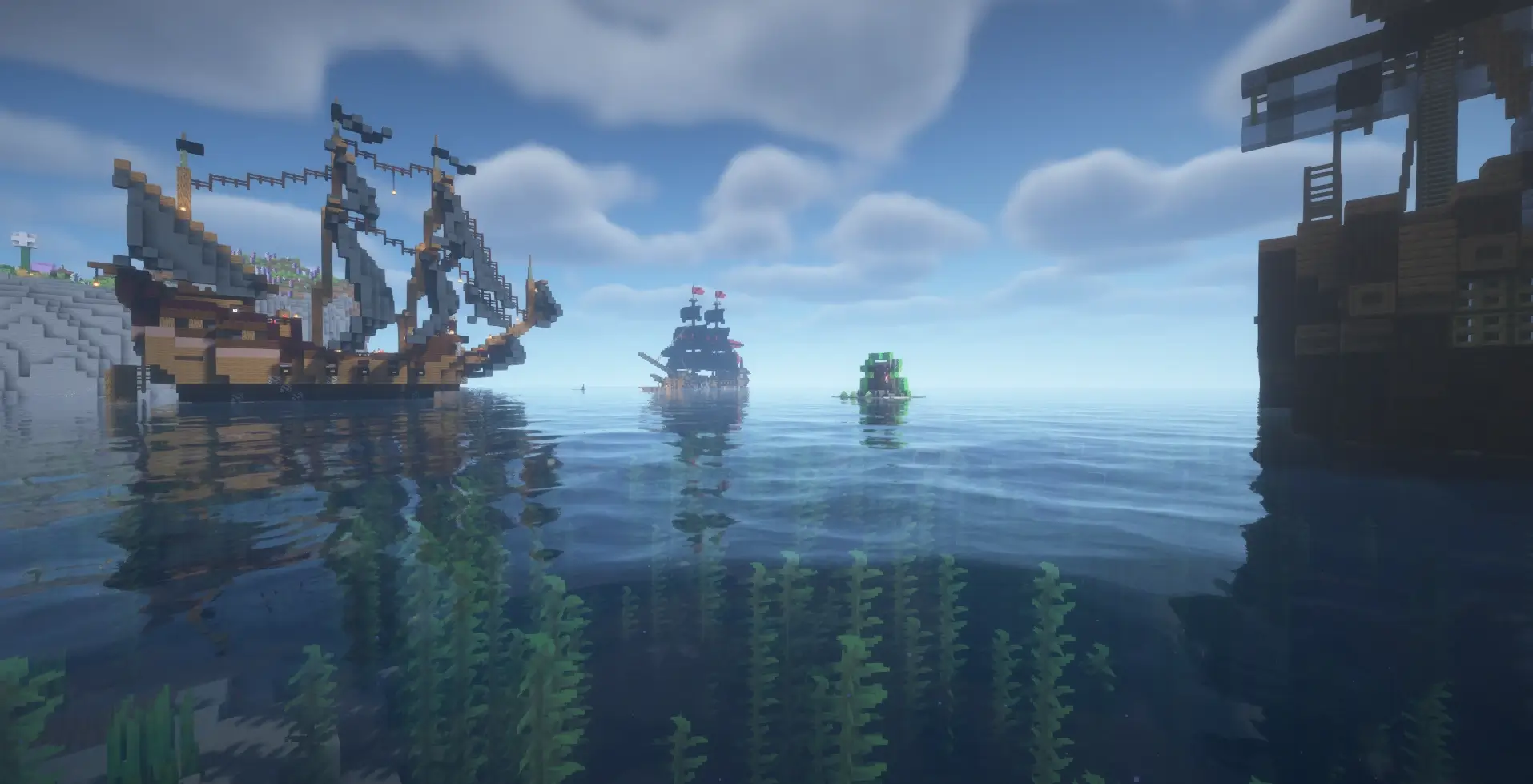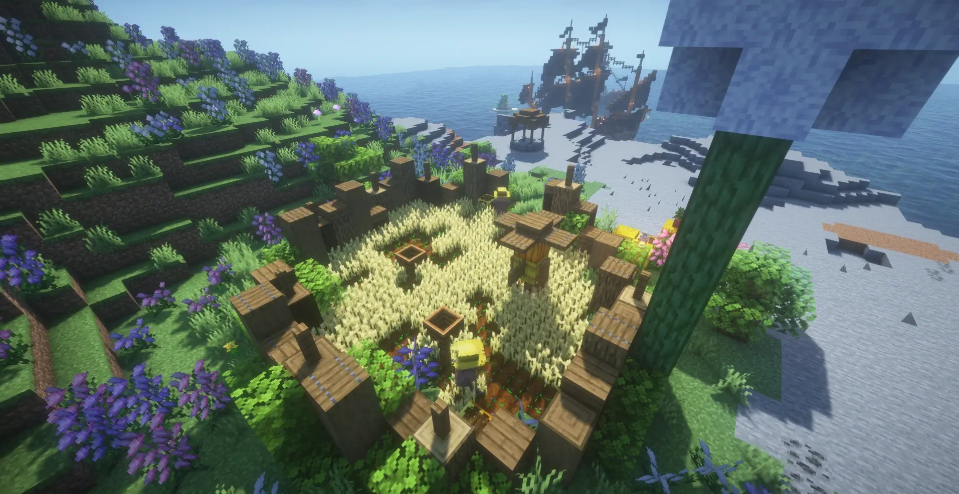 Spawn on a cliff island with cherry blossoms, surrounded by ocean. Nearby shipwrecks and ruins offer loot—perfect mix of beauty, survival, and exploration.