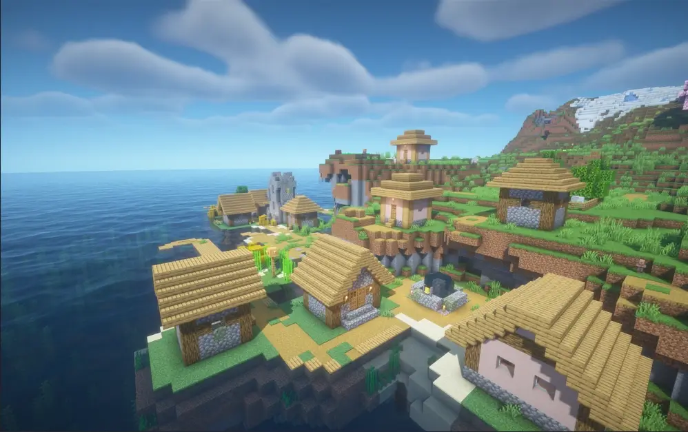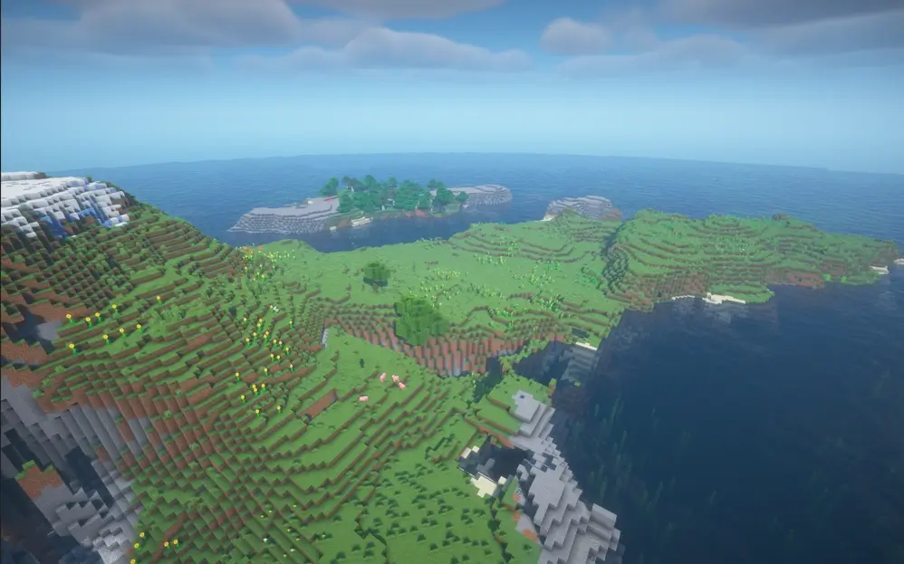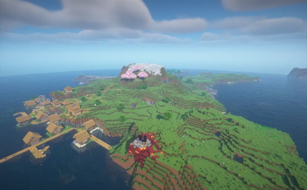 Experience the ultimate cozy start on this serene island, featuring a vibrant cherry grove nestled against a snow-capped mountain peak. The landscape is draped in rolling green meadows and includes a charming seaside village, making it a perfect picturesque haven for any builder.