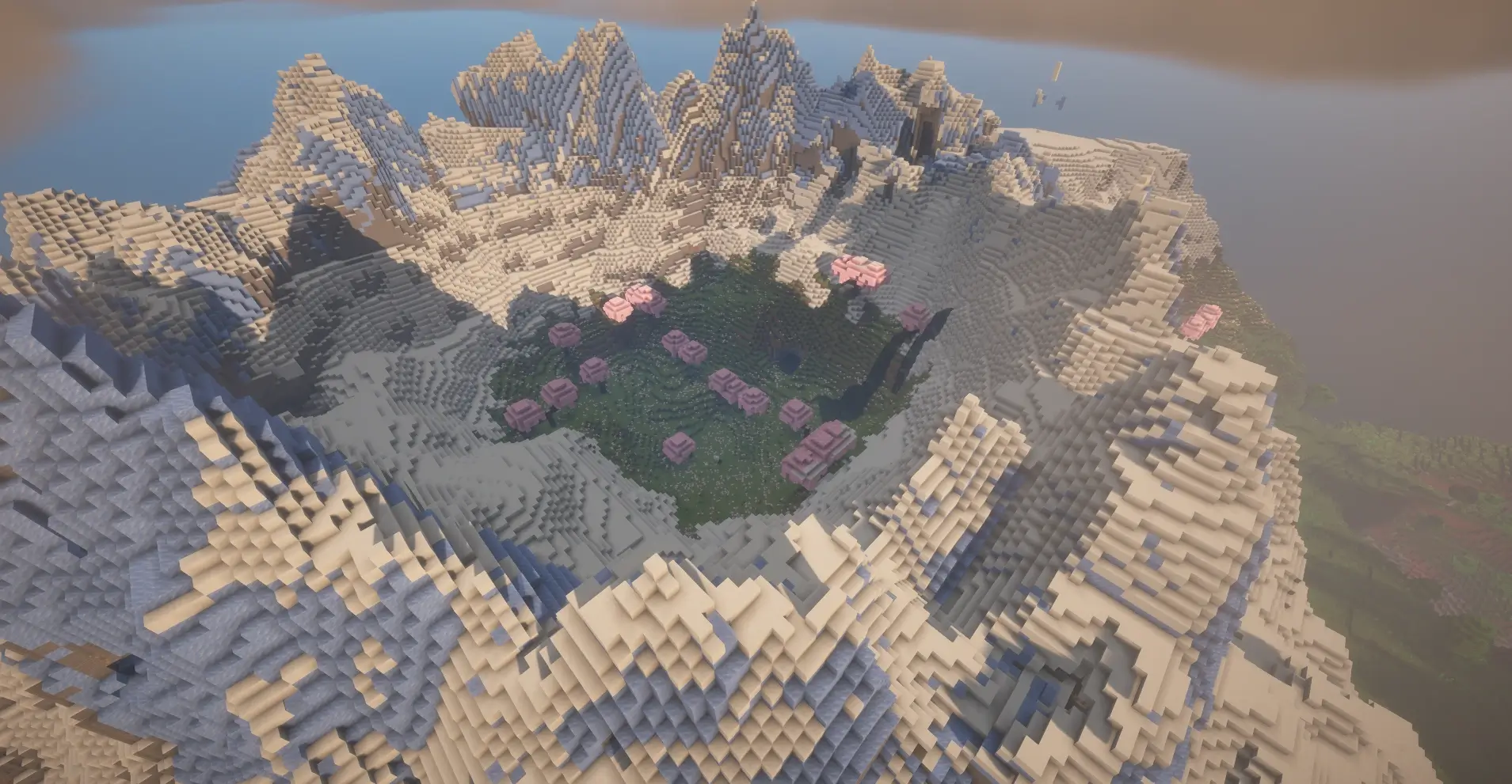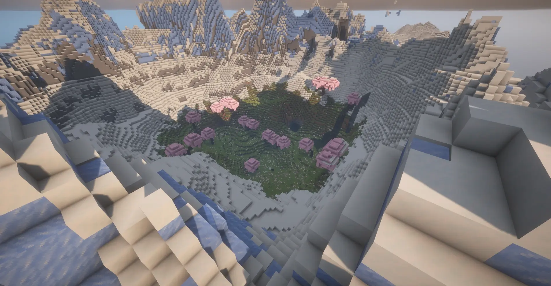 Amazing Minecraft seed with a hidden cherry grove crater, giant snowy mountains, and a perfect survival base location.