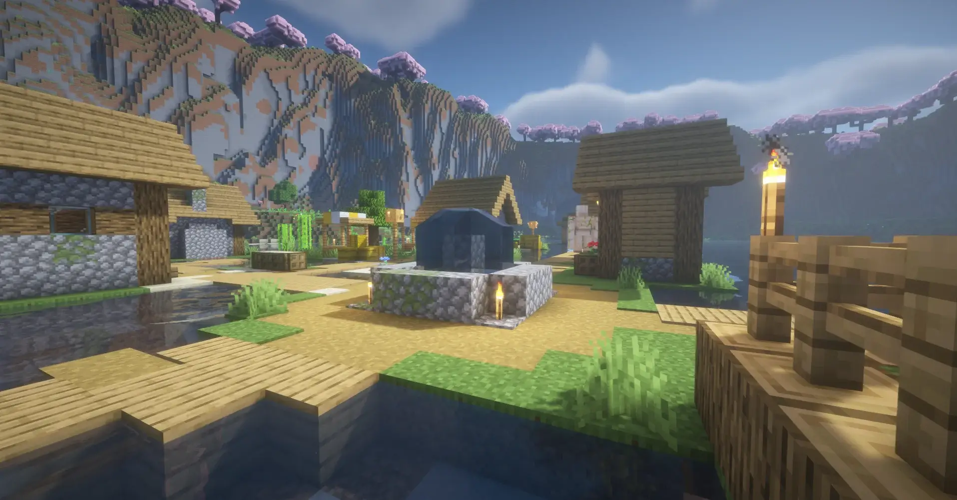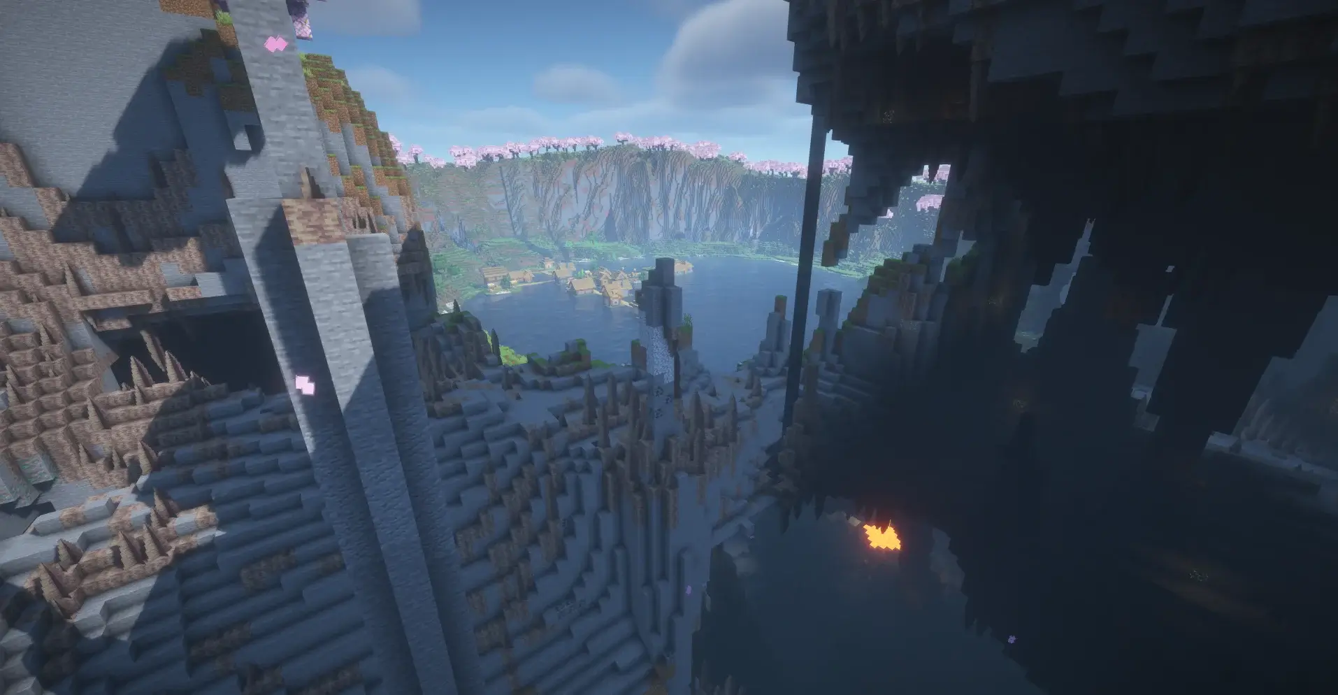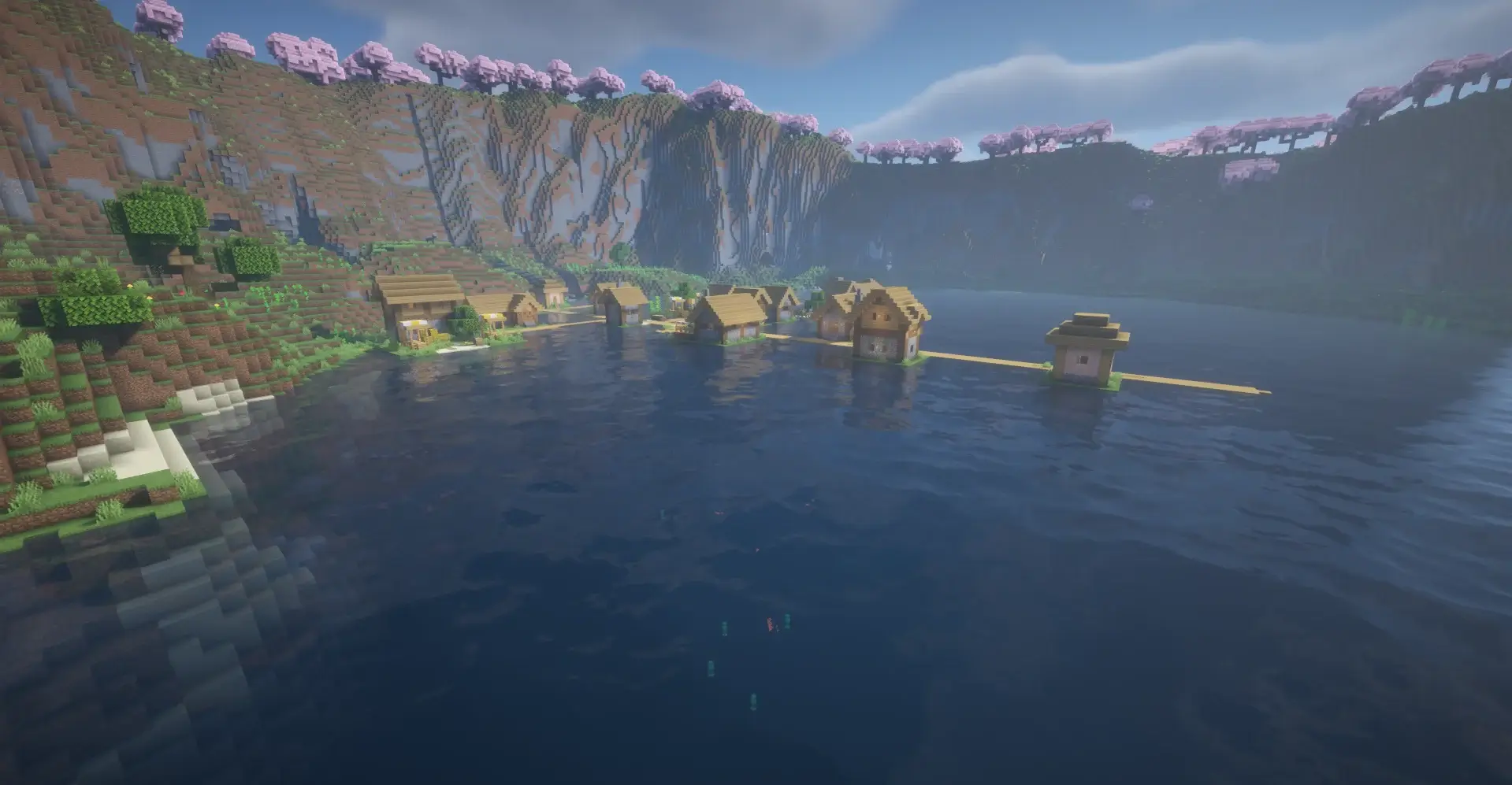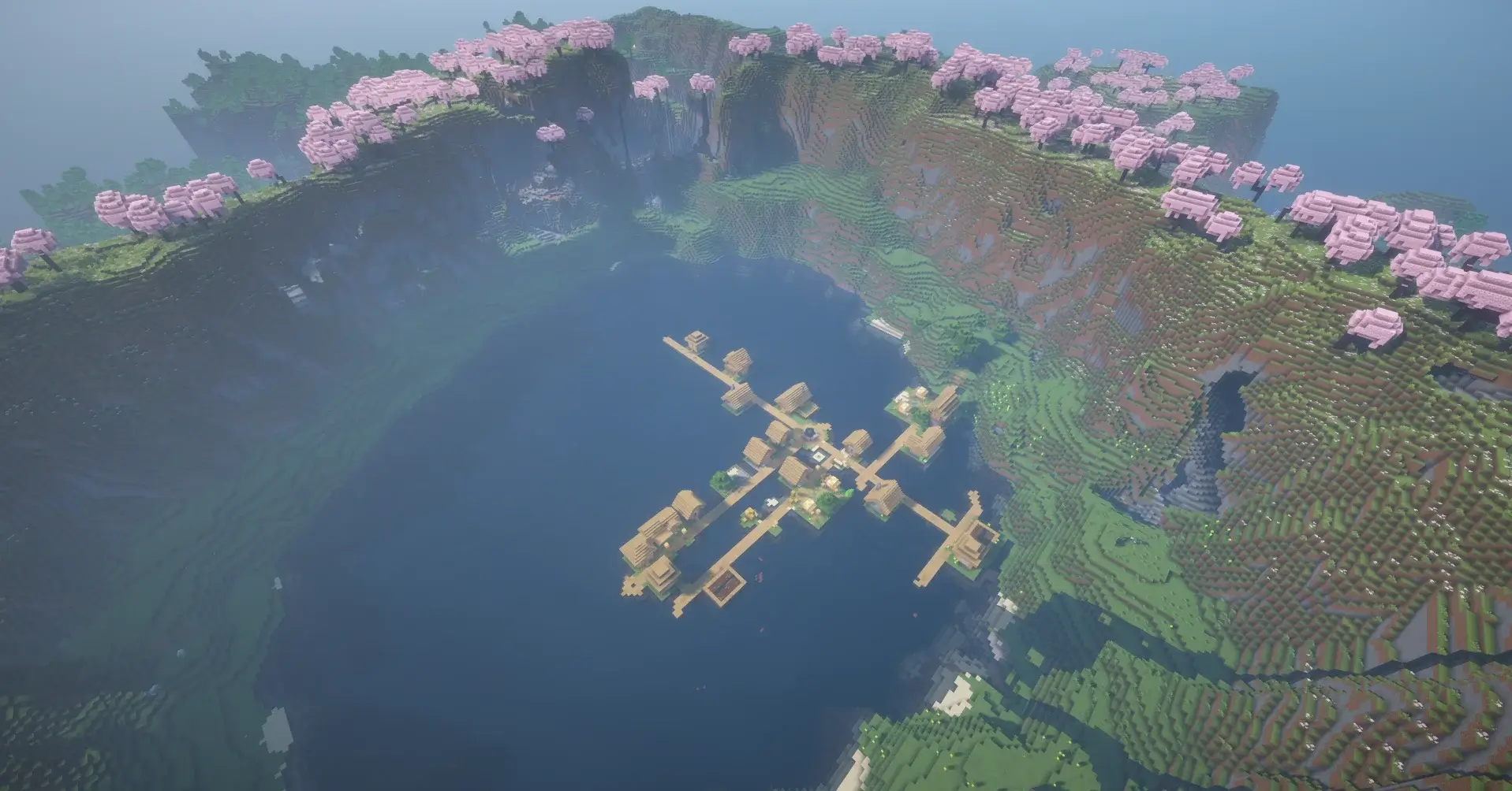 A village in the center of a massive lake surrounded by cherry blossom cliffs.