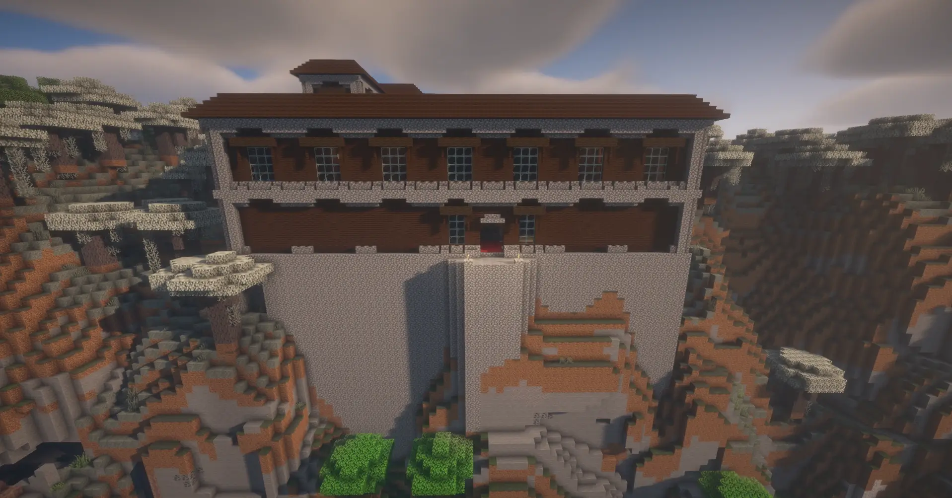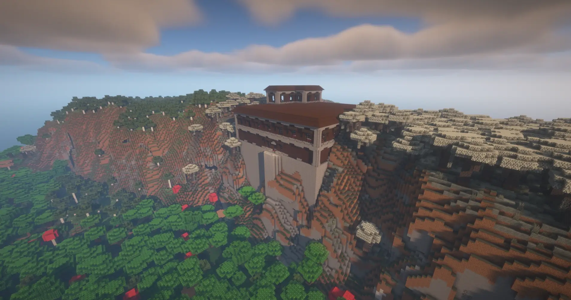 A woodland mansion sitting on a high cliff with stunning views and a nearby lava fall.