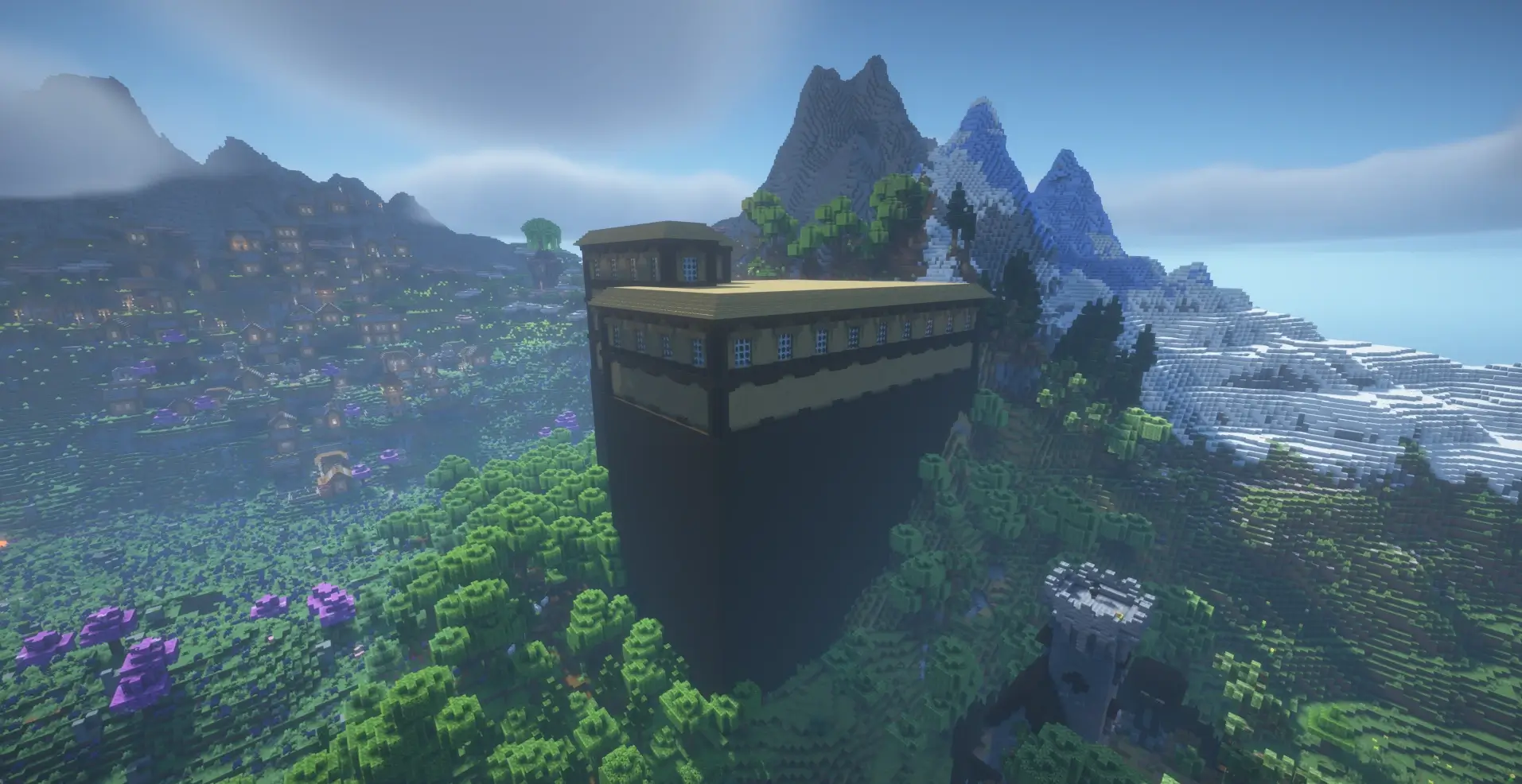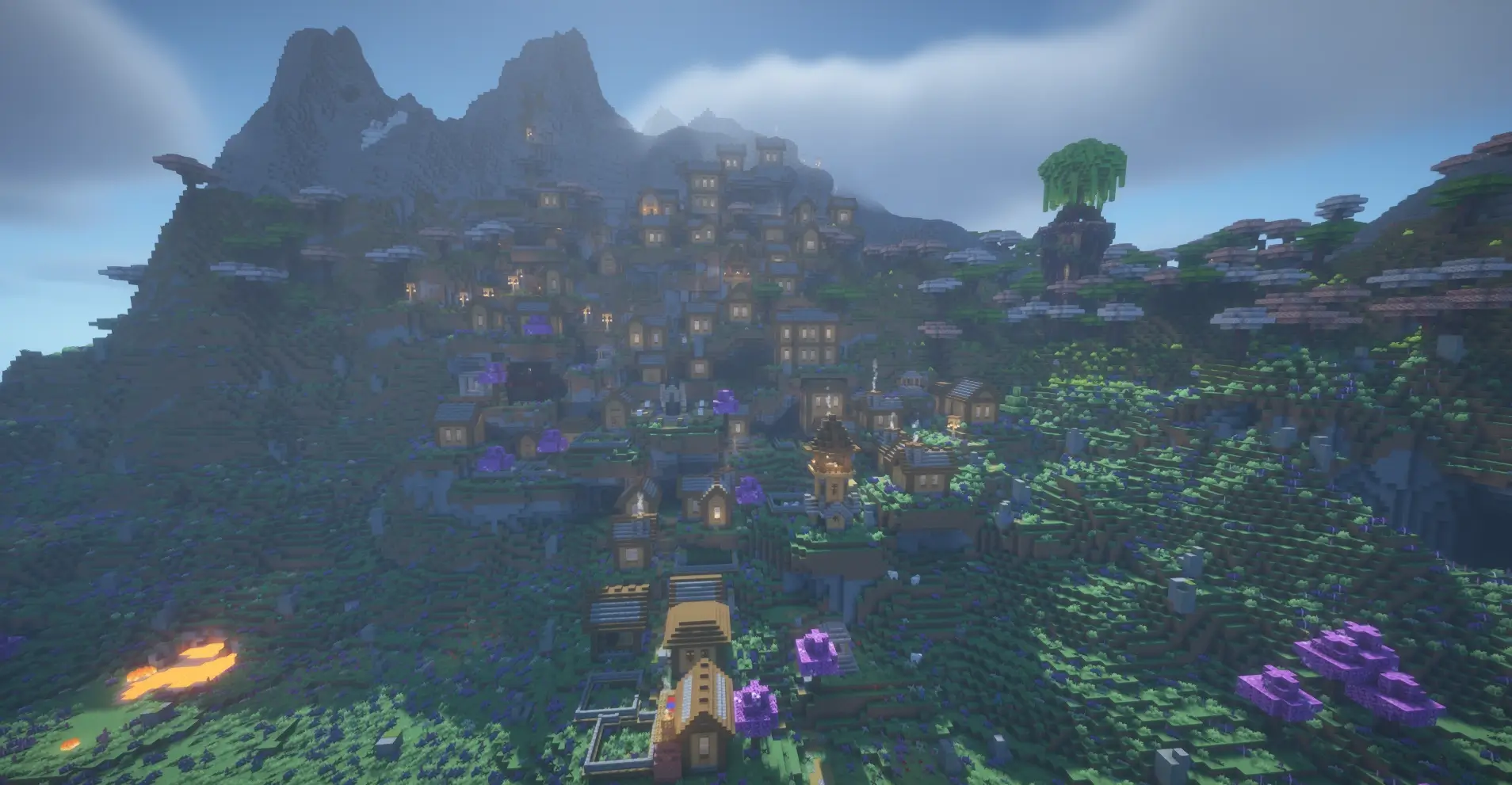 ATM10 seed with a cliff mansion and giant village in a scenic mountain valley.