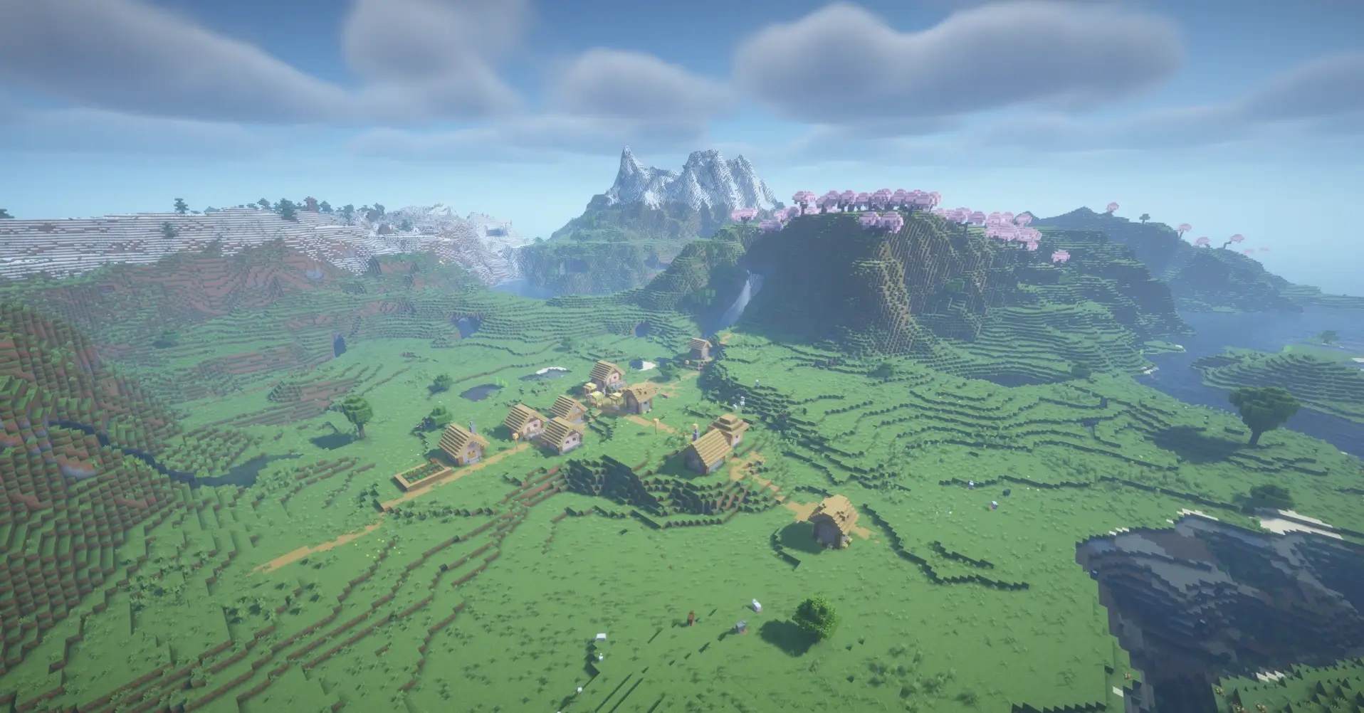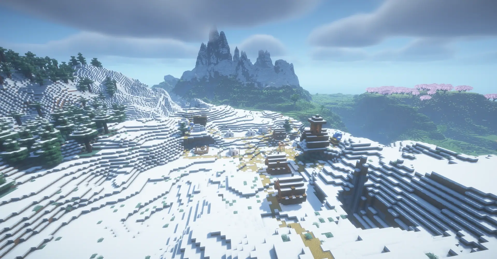 This seed features a towering snowy mountain rising above a green valley and deep rivers. Around the mountain you can find four nearby villages, making it a great place for trading, loot, and early survival. The dramatic mix of snowy peaks, plains, and caves creates a perfect landscape for exploration and building.