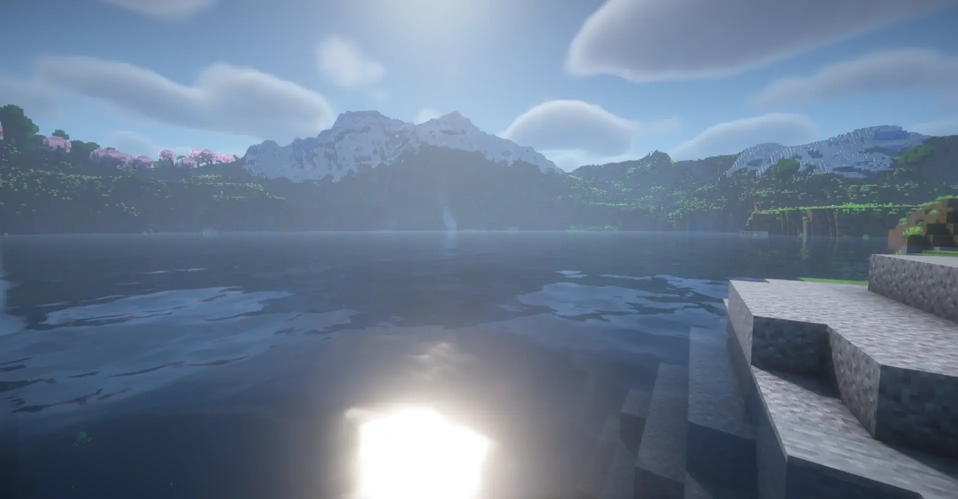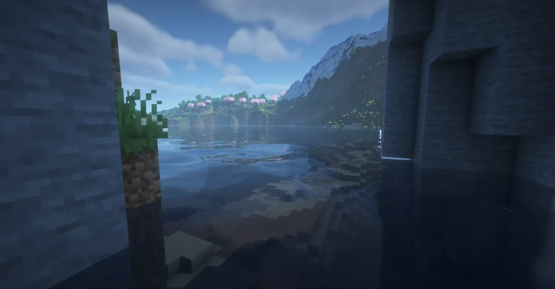 A nice bay with mountains, trees, and water. Good place to build a house and explore.