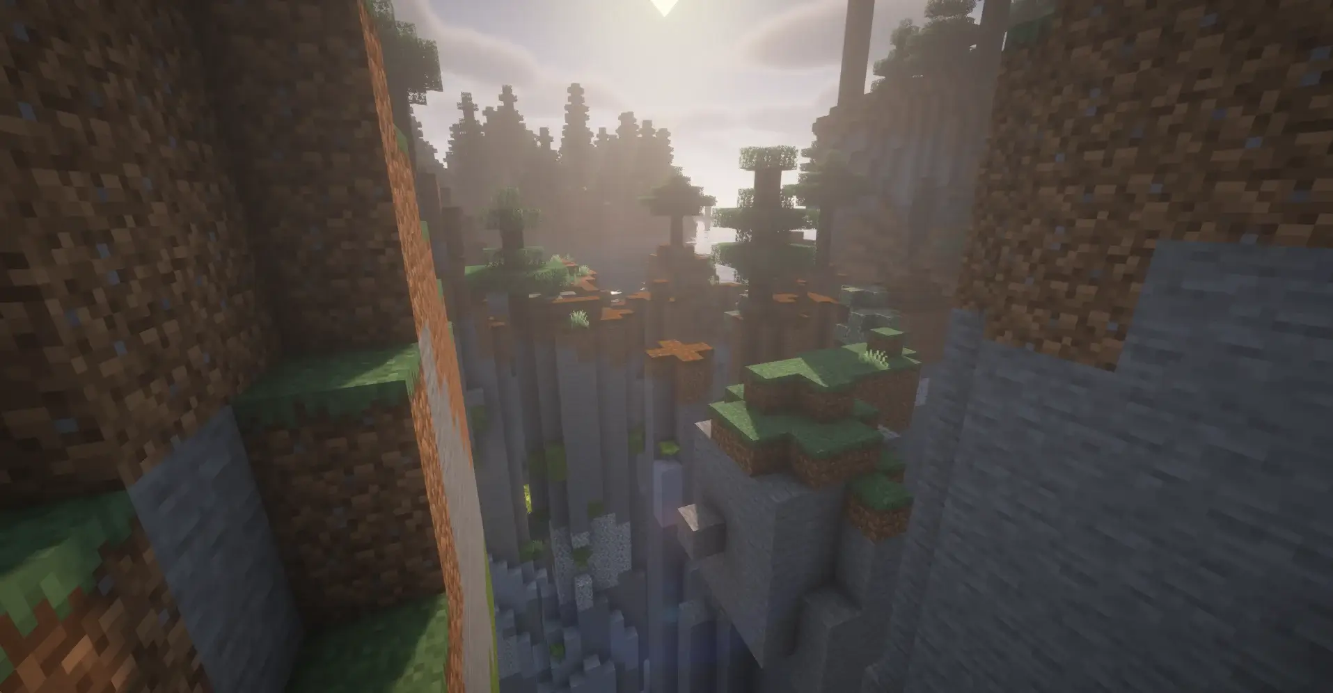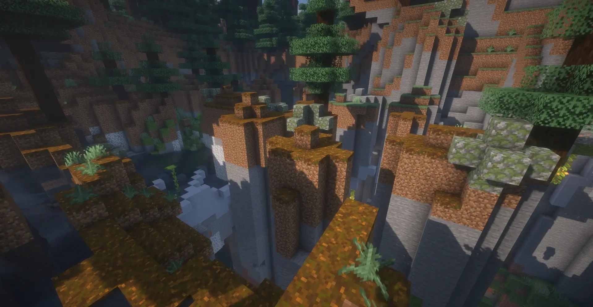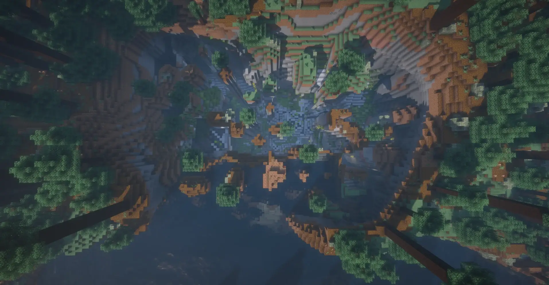 A big canyon with water and trees around. Good place for exploring and building.