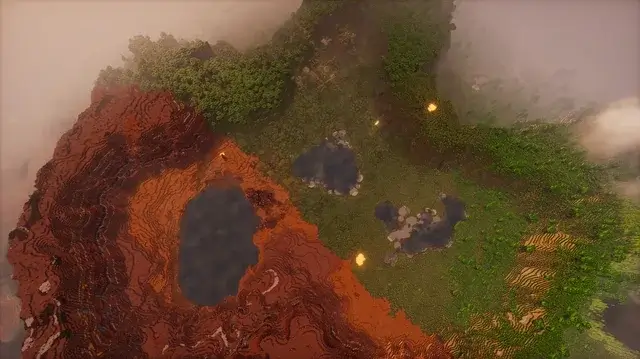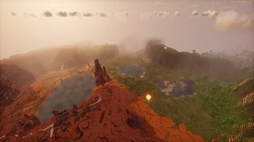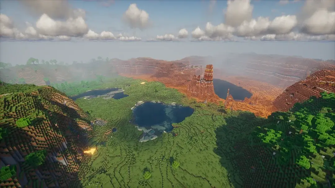 This seed will welcome you at spawn with a triple lake in a large biome diversity, with each lake divided by a different biome, one in a plain biome with a village, another in a jungle and a larger one in an eroded badlands with a nice spike next to it. Credits: Reddit u/ZennithMc