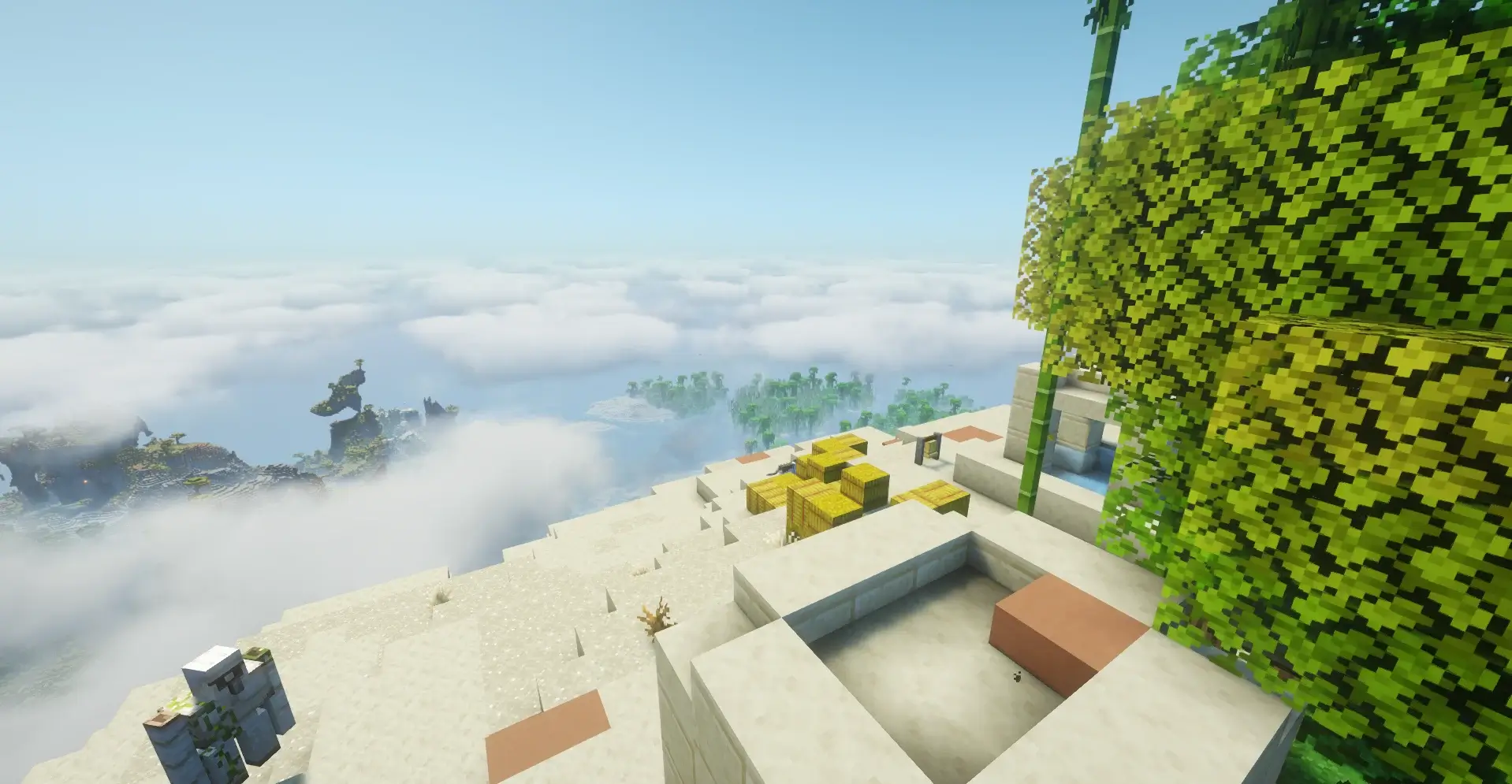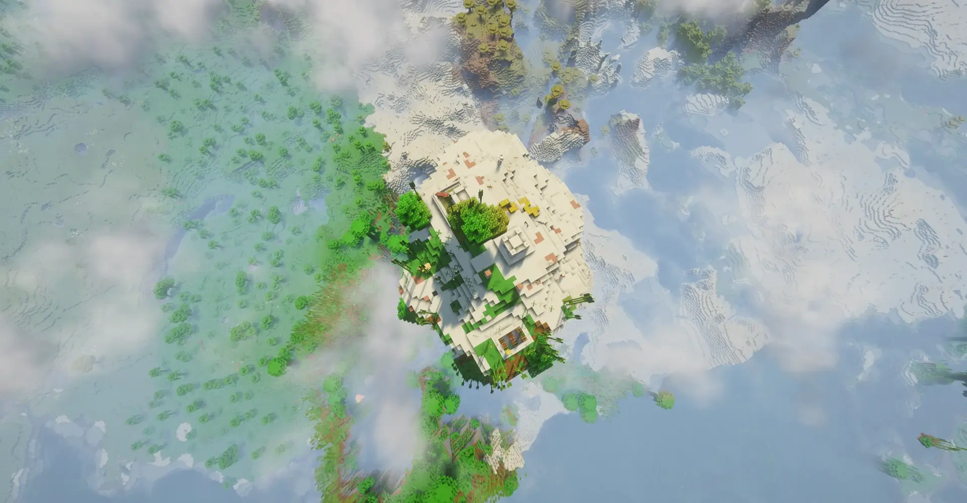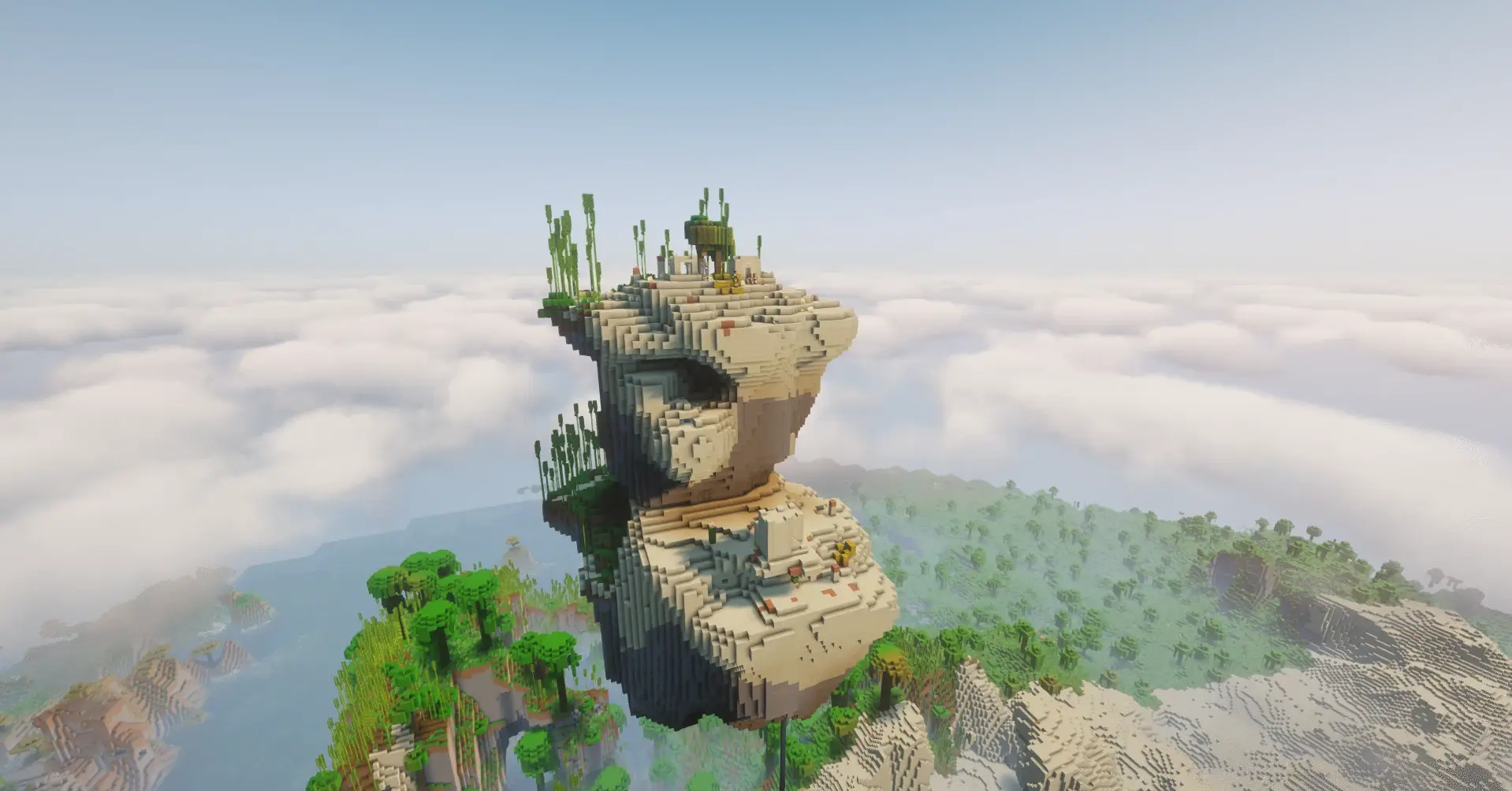 This is an amazing floating island with a rare desert village perched high in the sky. It is a very cool and simple spawn because the villagers are safe from ground monsters, and you get a perfect view of the jungle below. This unique spot is great for building a legendary base that literally touches the clouds.