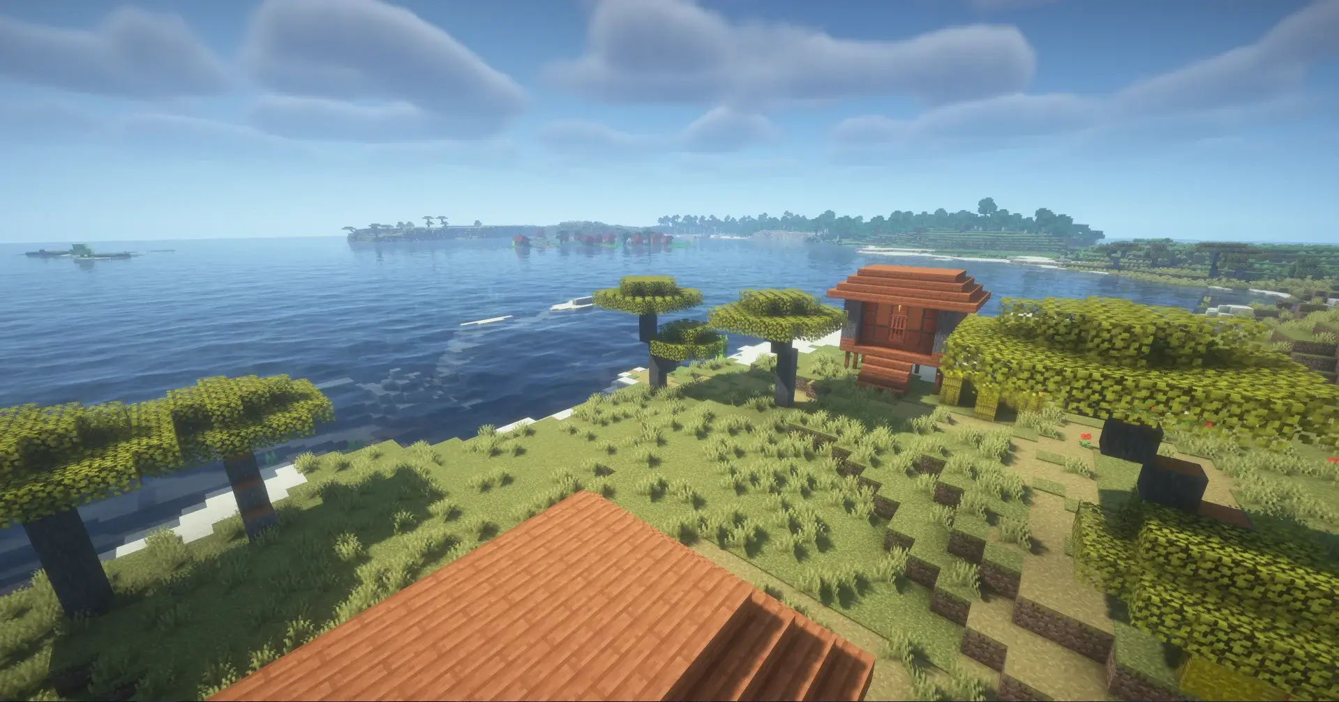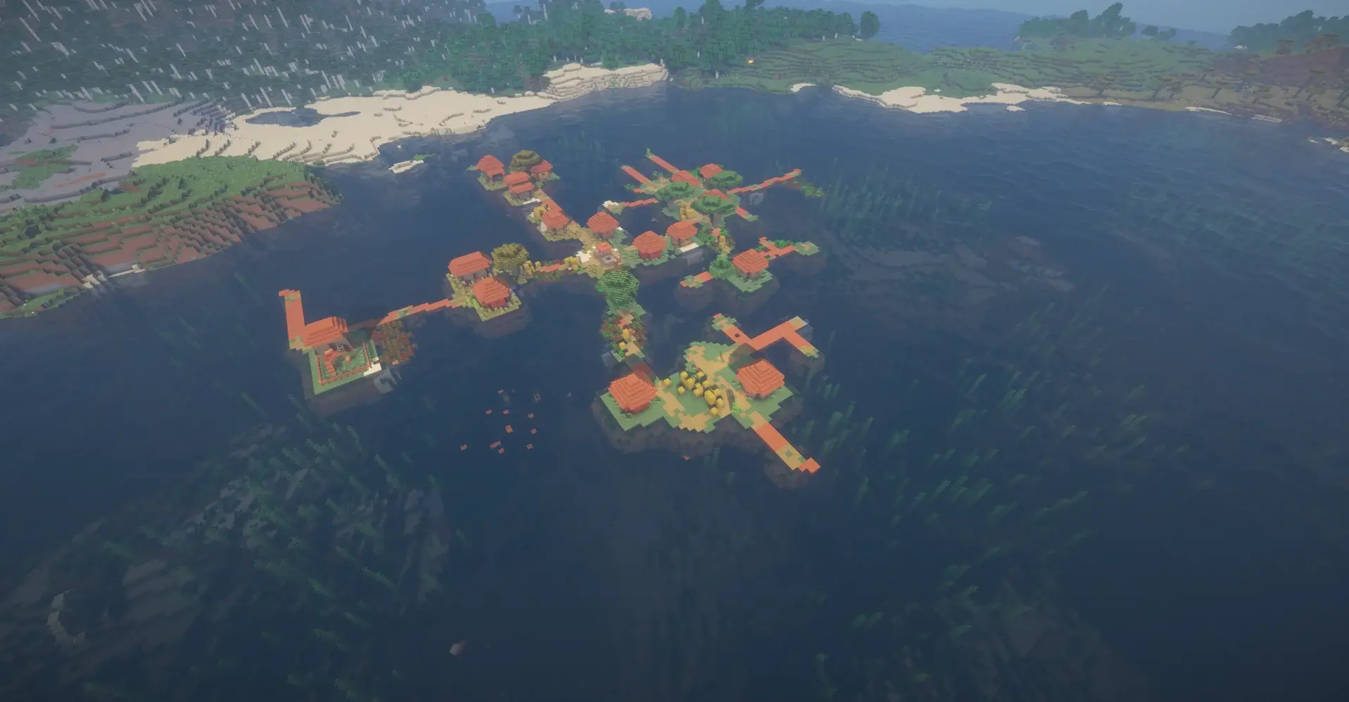 You will spawn next to a rare floating Savanna village drifting across a serene lake, featuring unique wooden piers and houses over the water. Just a short distance away, a second village sits nestled along the shoreline, creating a massive, interconnected hub for trading and exploration.