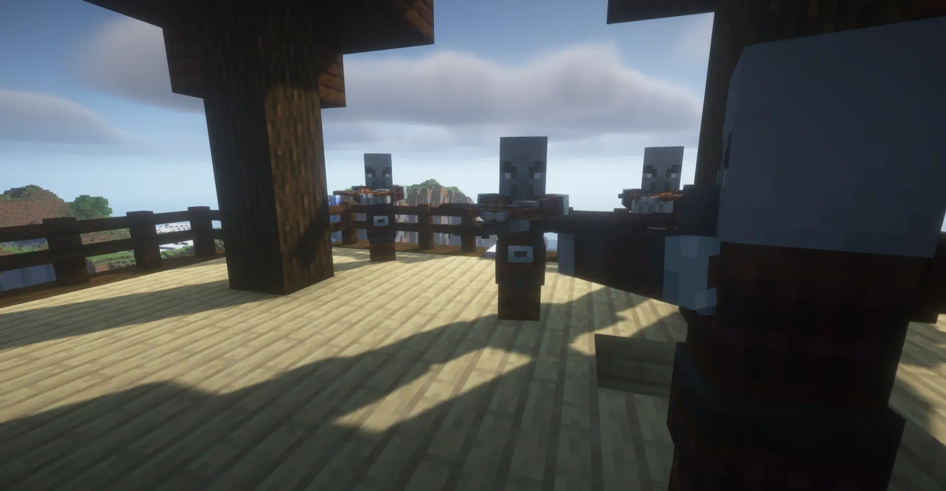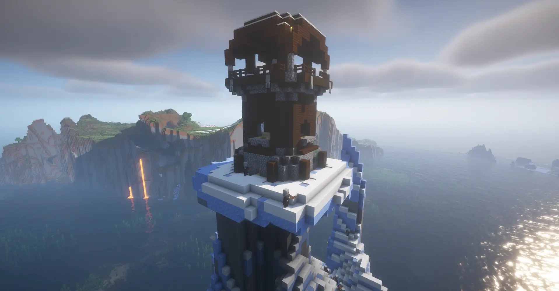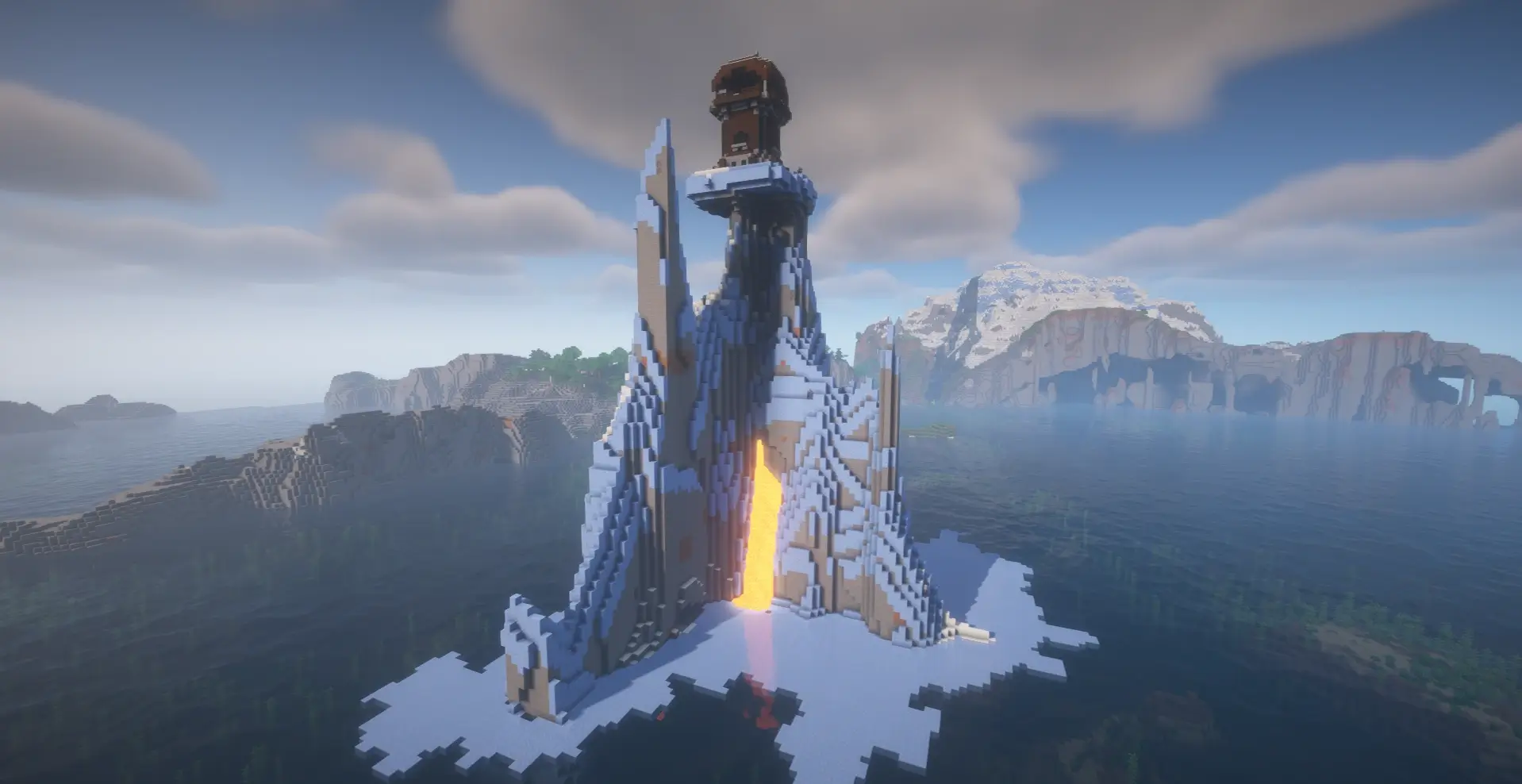 A lone icy spire rises from the ocean, crowned by a pillager outpost. Nearby cliffs and lava flows create a dramatic, dangerous start with epic views.