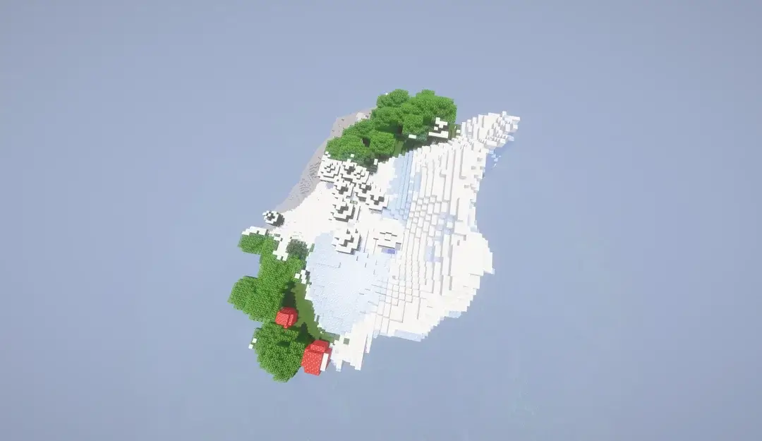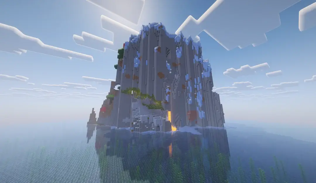 You spawn in a really big ocean, on top of a dark forest/frozen peaks island with some beautiful lush cave and cliff generation.
