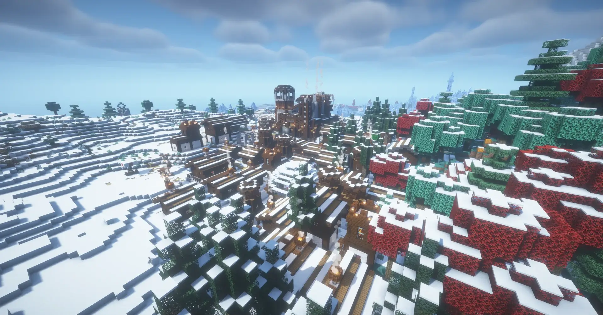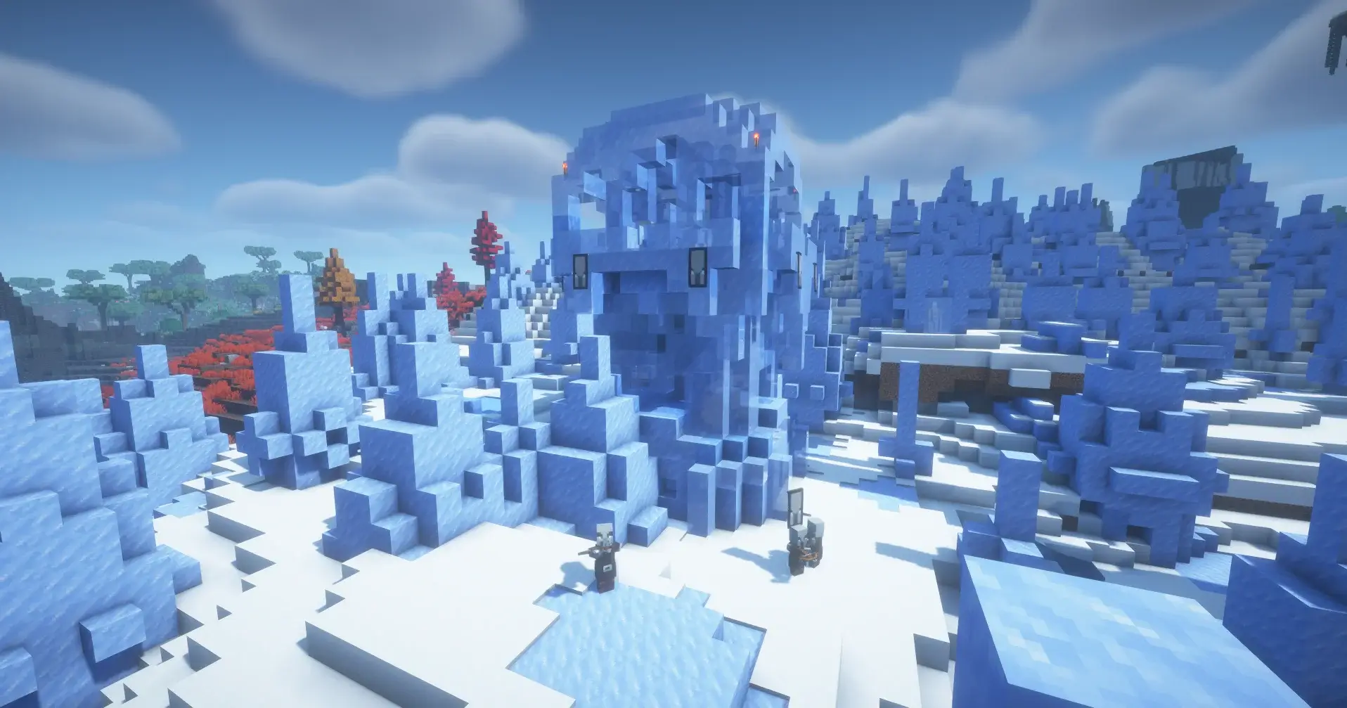 A rare floating island with a cozy house above a frozen biome. Nearby are an ice pillager outpost and a snowy village, making it a unique survival start.