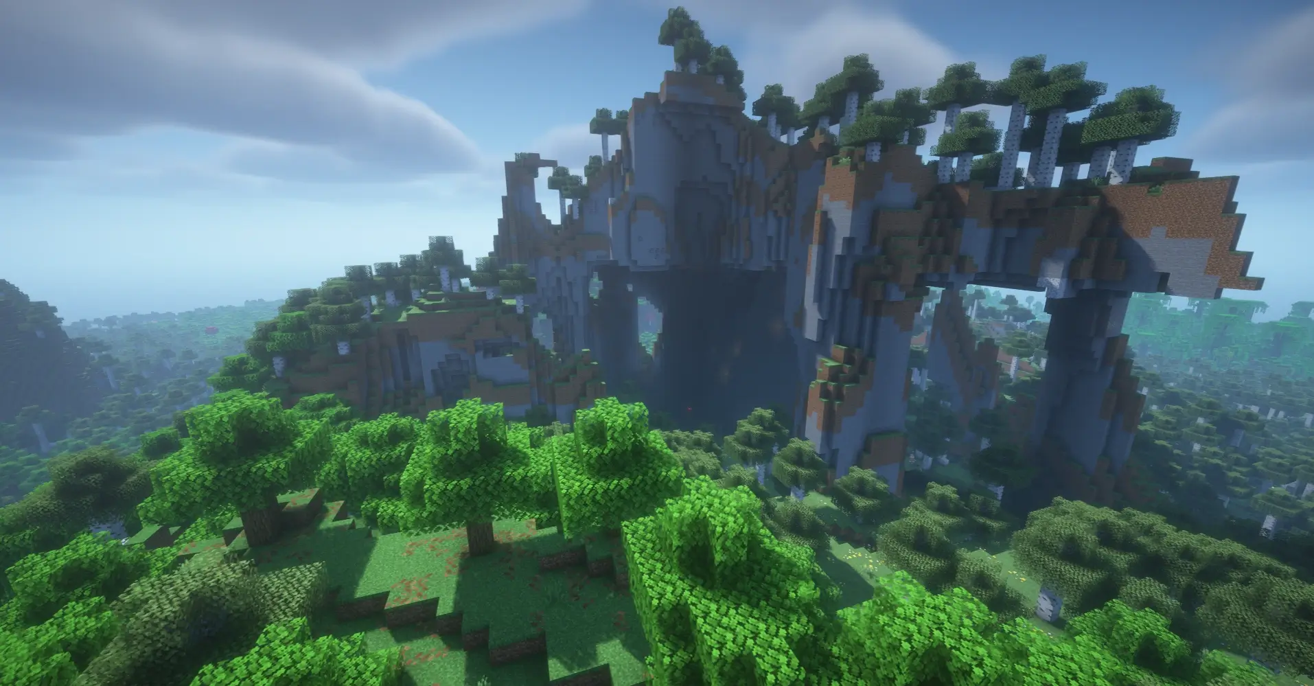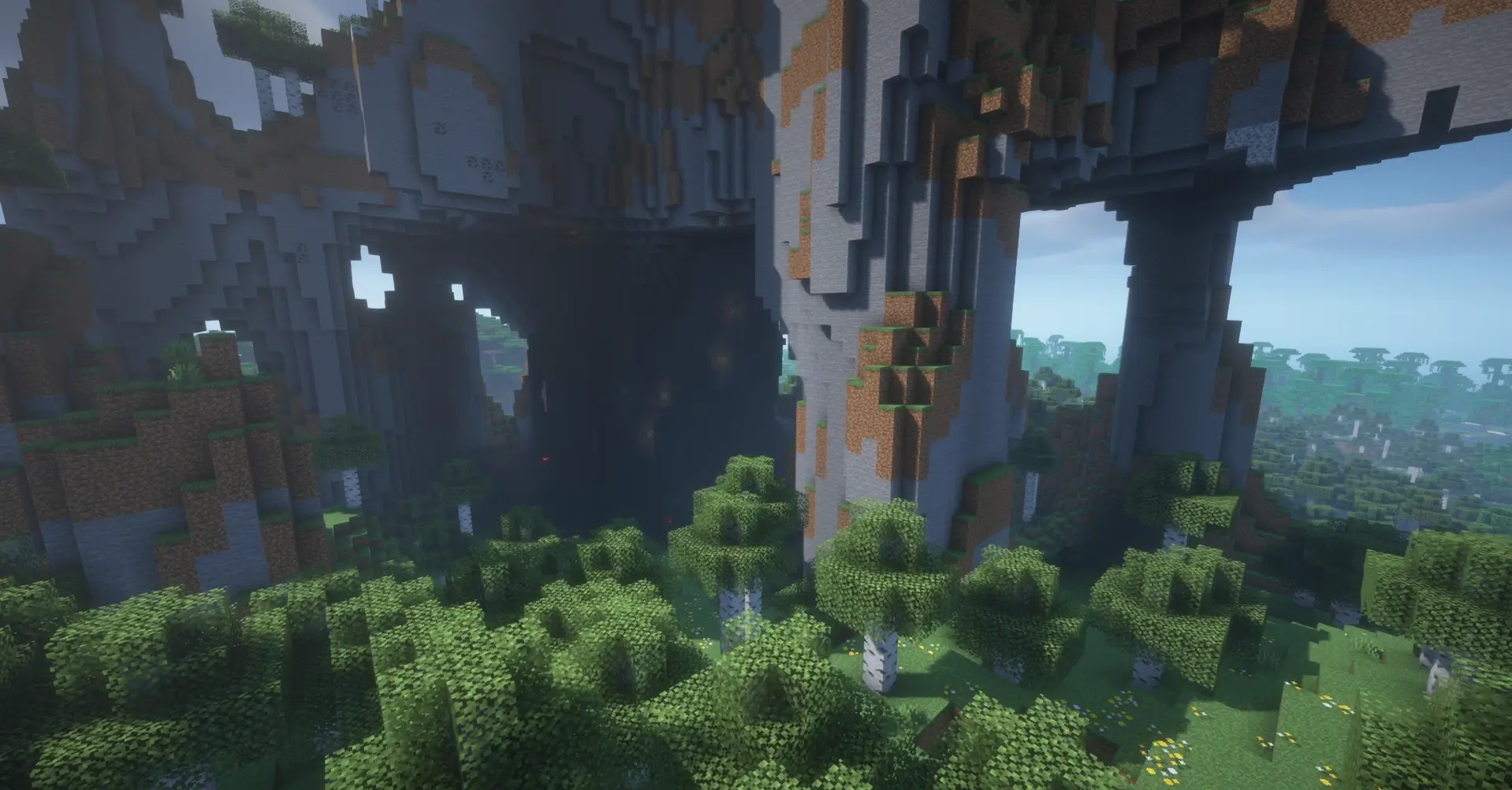 Spawn near a massive mountain arch with a huge open cave beneath it. Perfect spot for an epic base with dramatic cliffs, forests, and endless exploration.