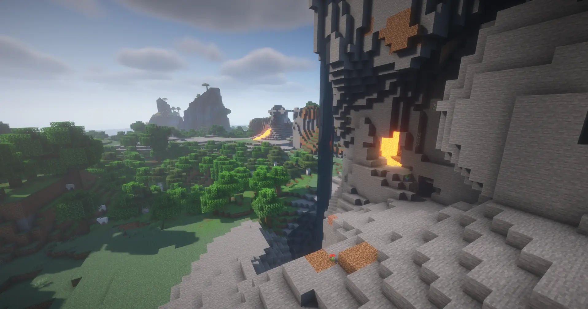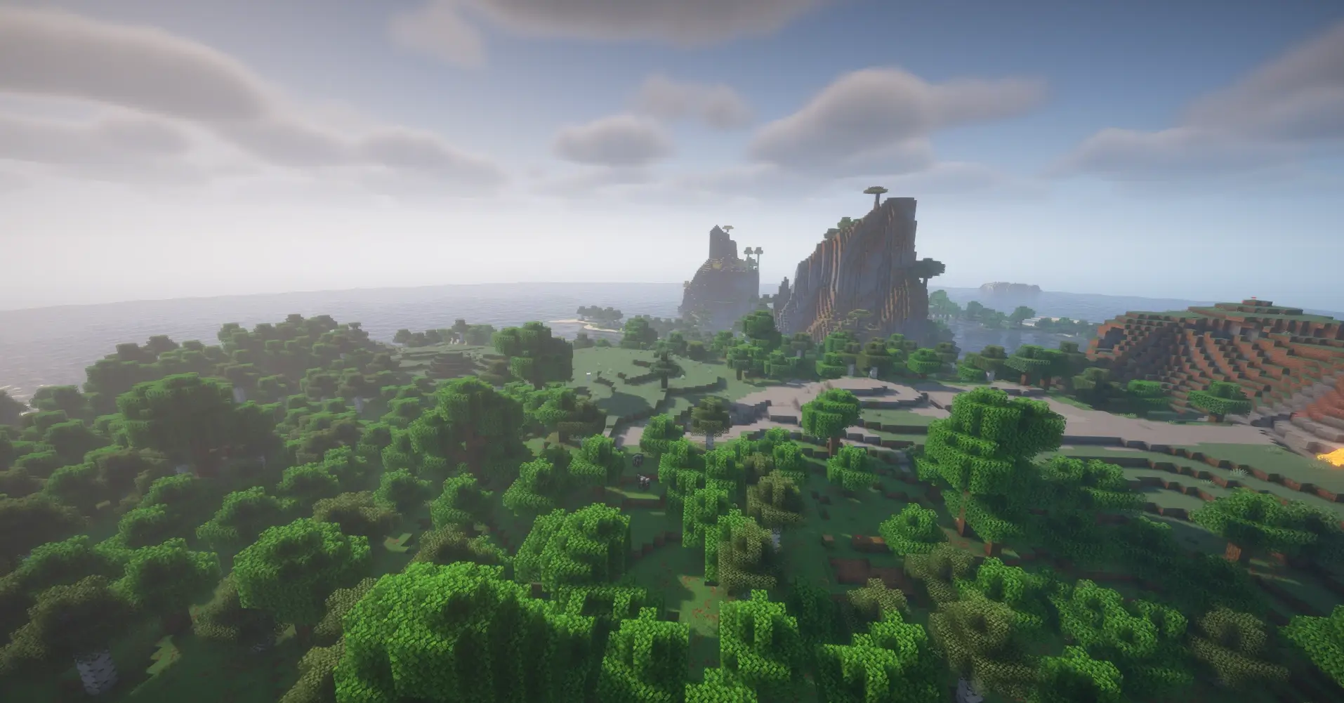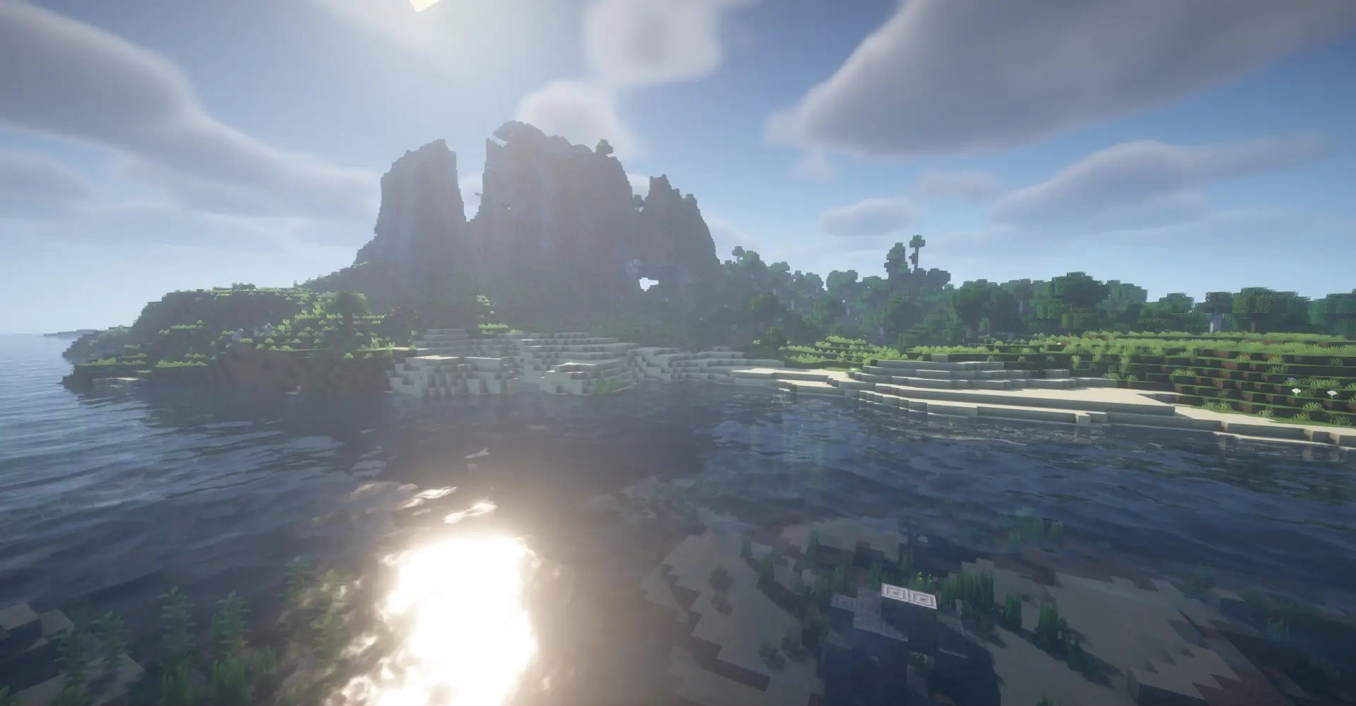 A massive crater ocean with a beautiful island in the center. Surrounded by high cliffs and forests — perfect location for an epic survival base.