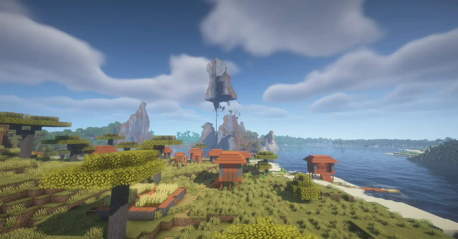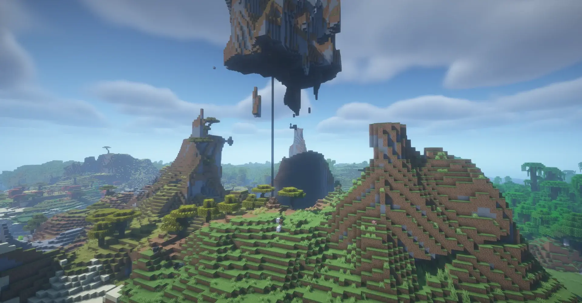 A massive floating mountain hanging in the sky above the landscape.