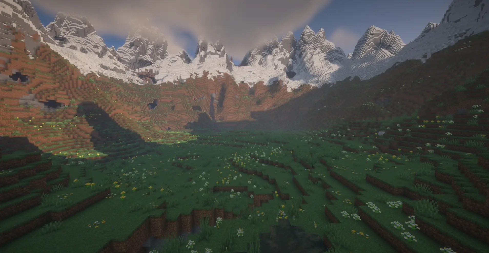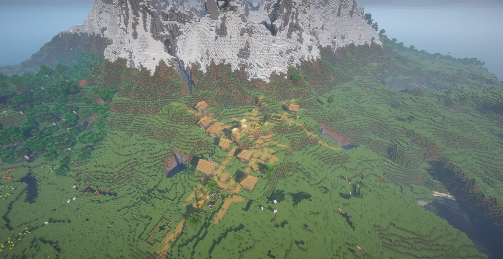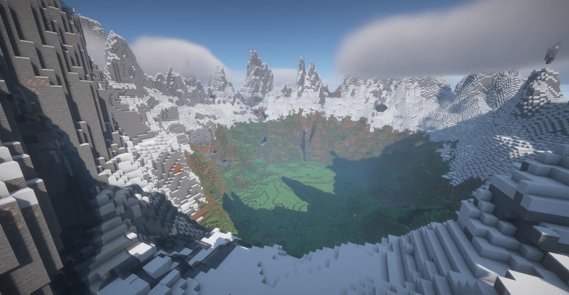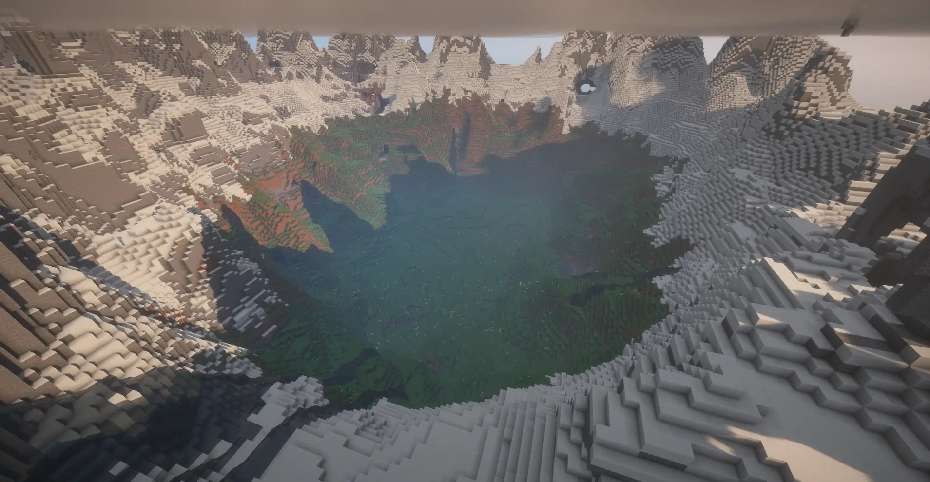 Beautiful Minecraft seed featuring a massive hidden basin, snowy peaks, nearby village, and perfect terrain for building.