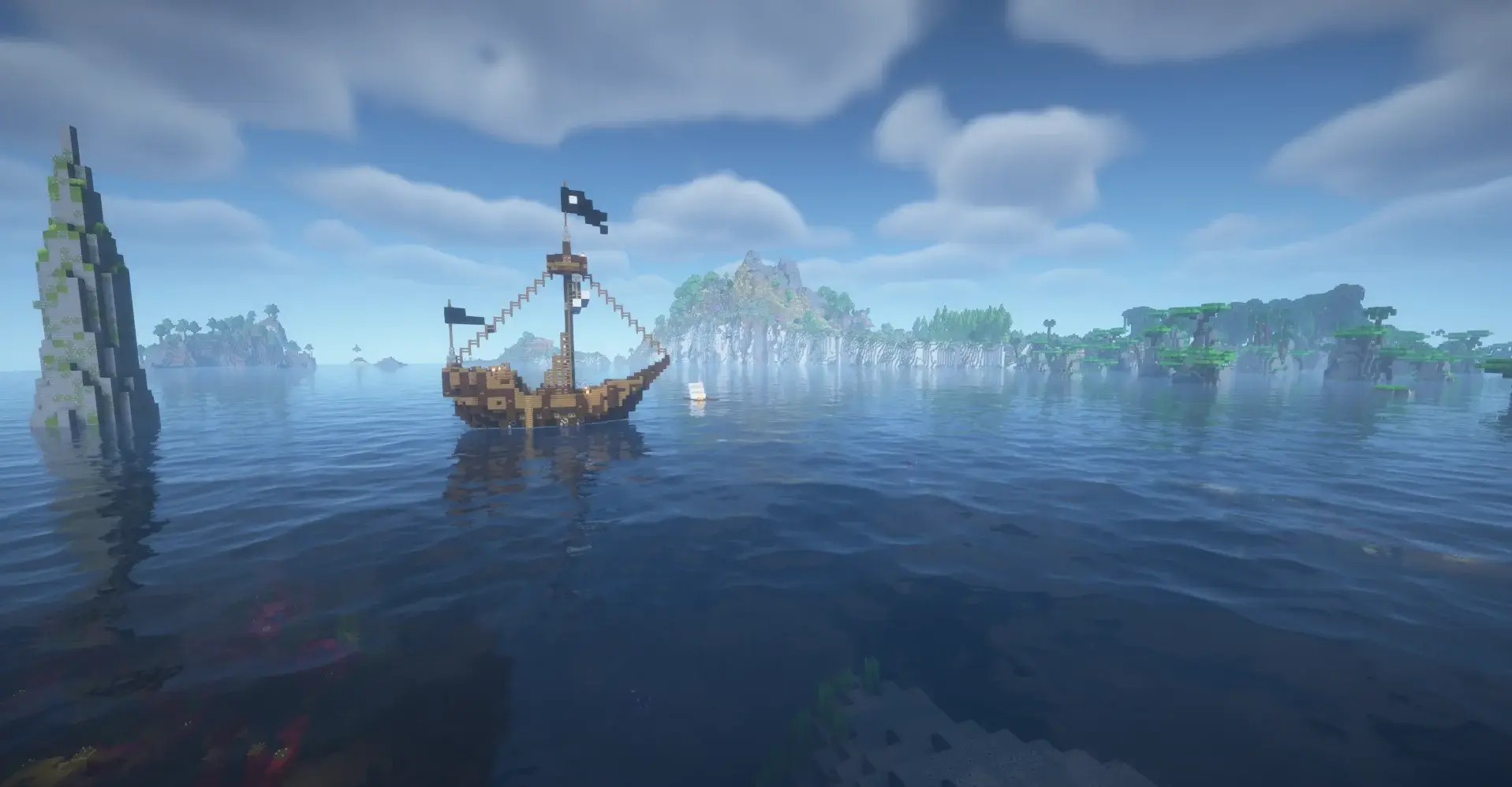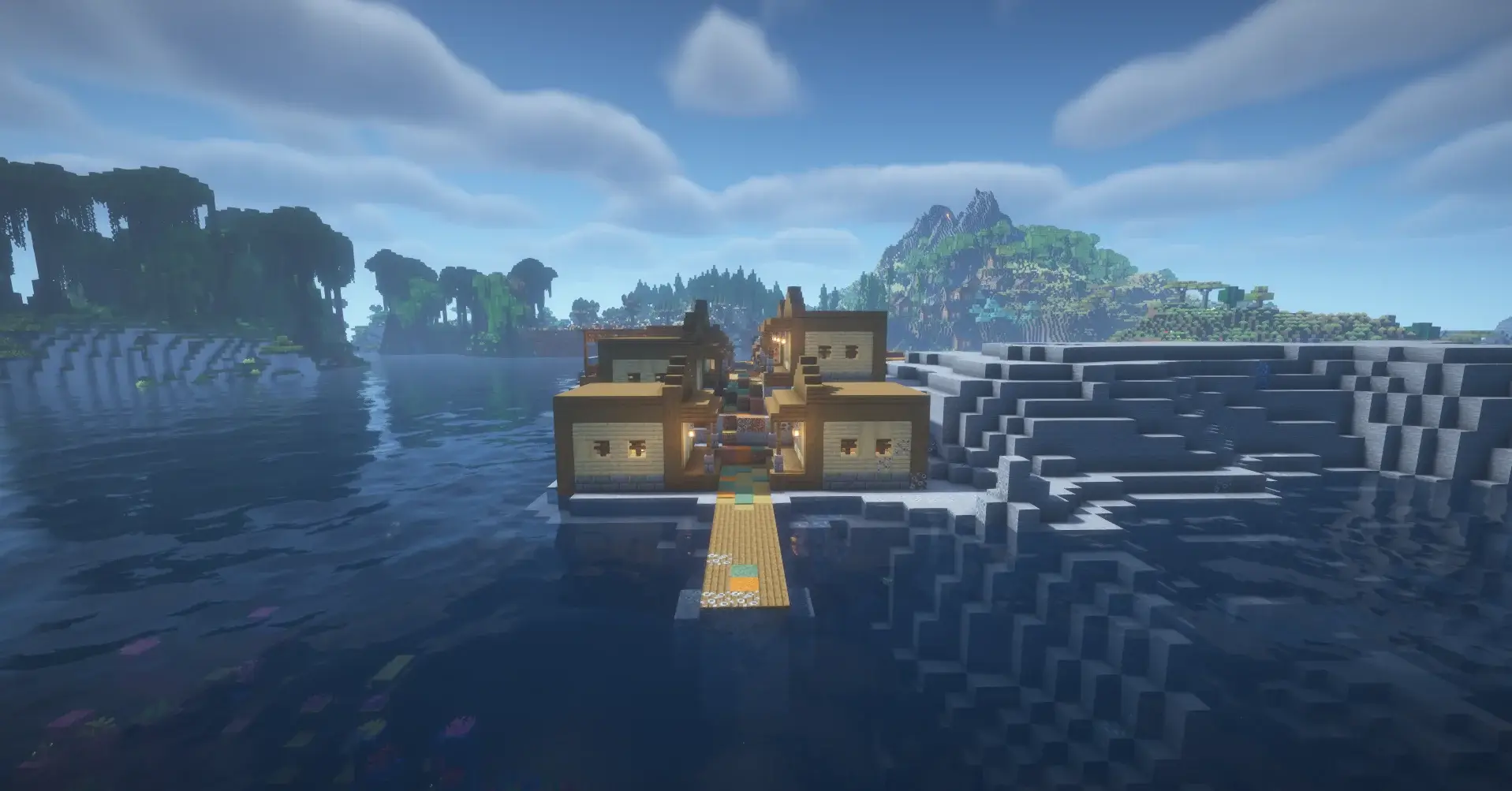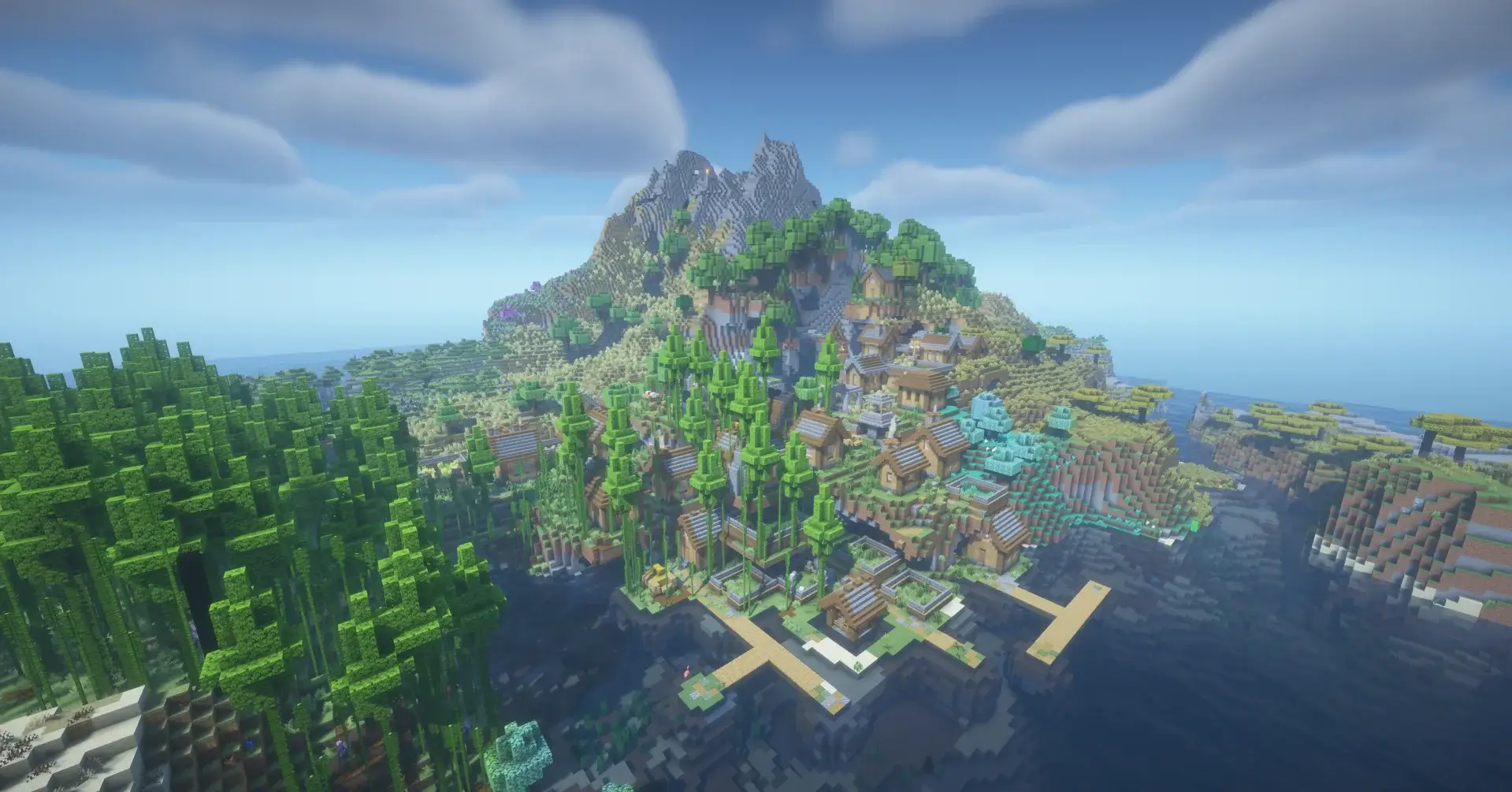 A beautiful island mountain with a large village surrounded by bamboo jungle and ocean. Beneath it lies a hidden cave village, perfect for exploration and survival.