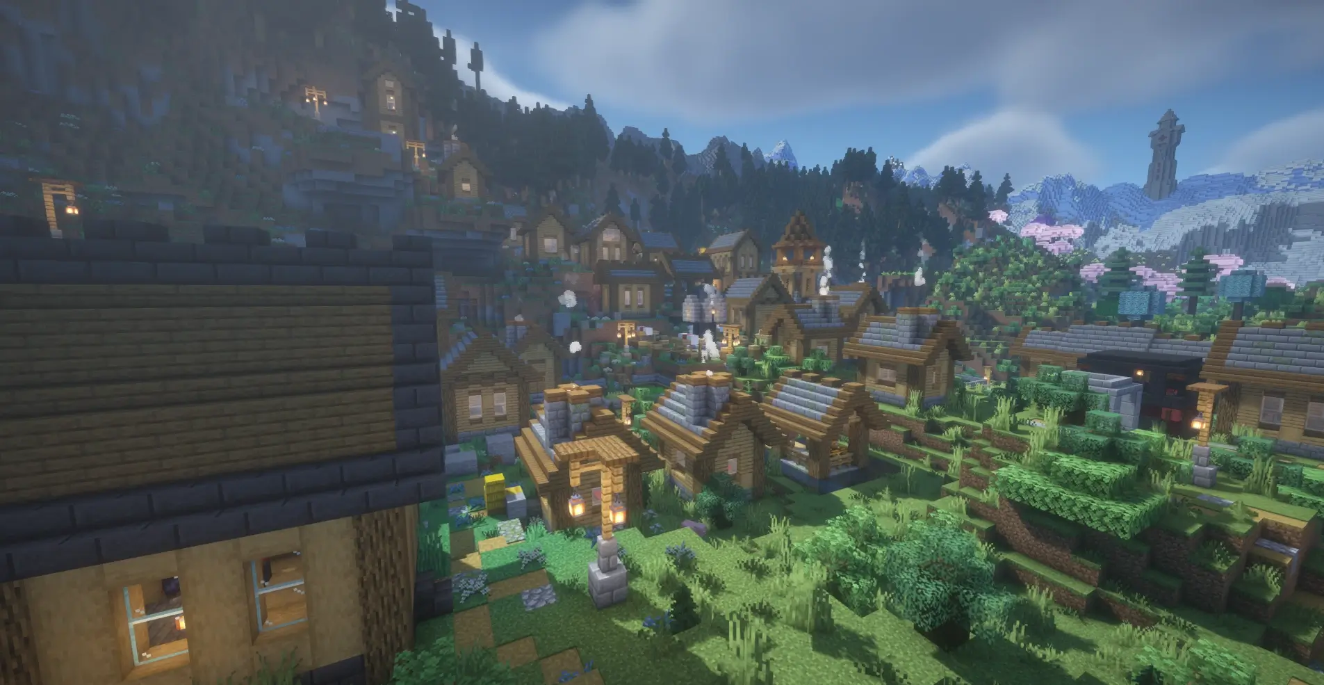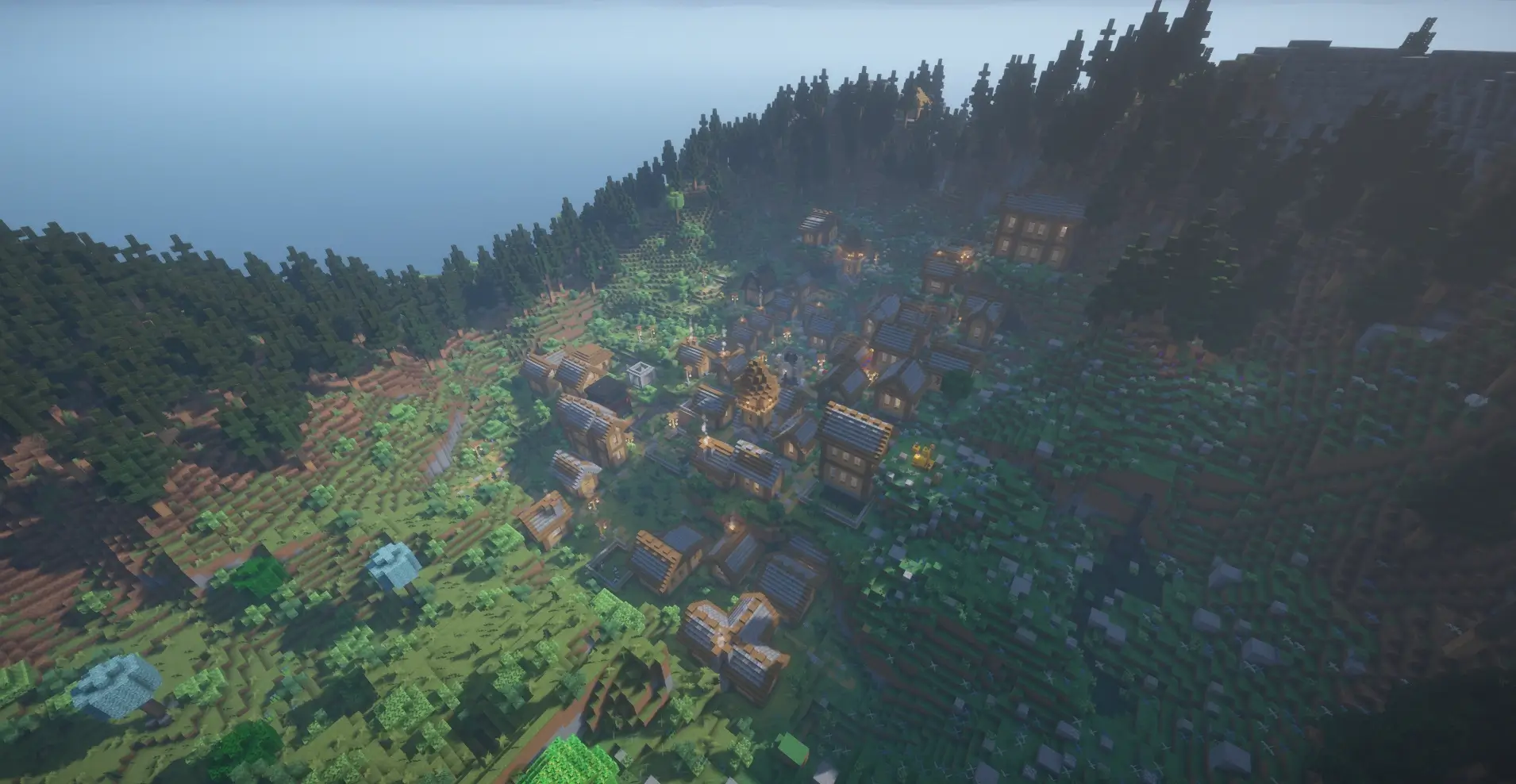 ATM10 seed with a hidden village in a forest valley, perfect for survival and building.