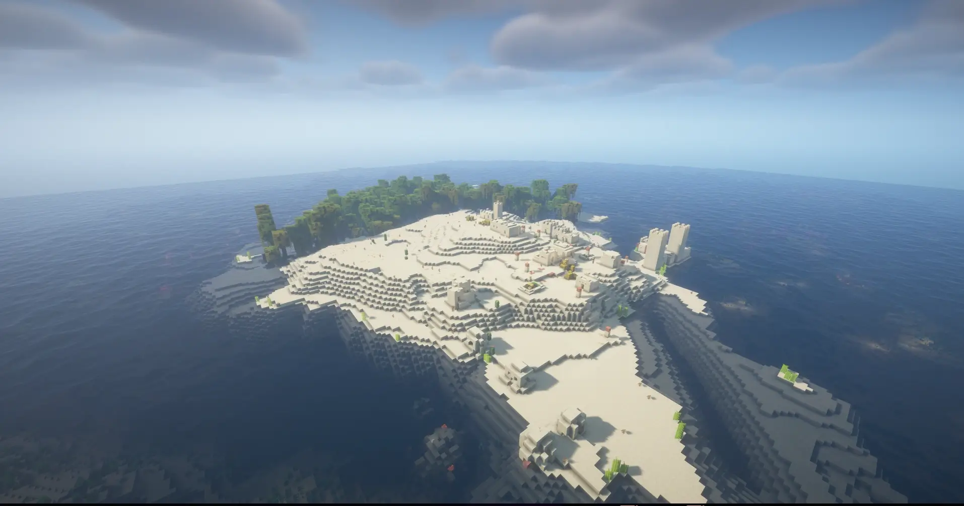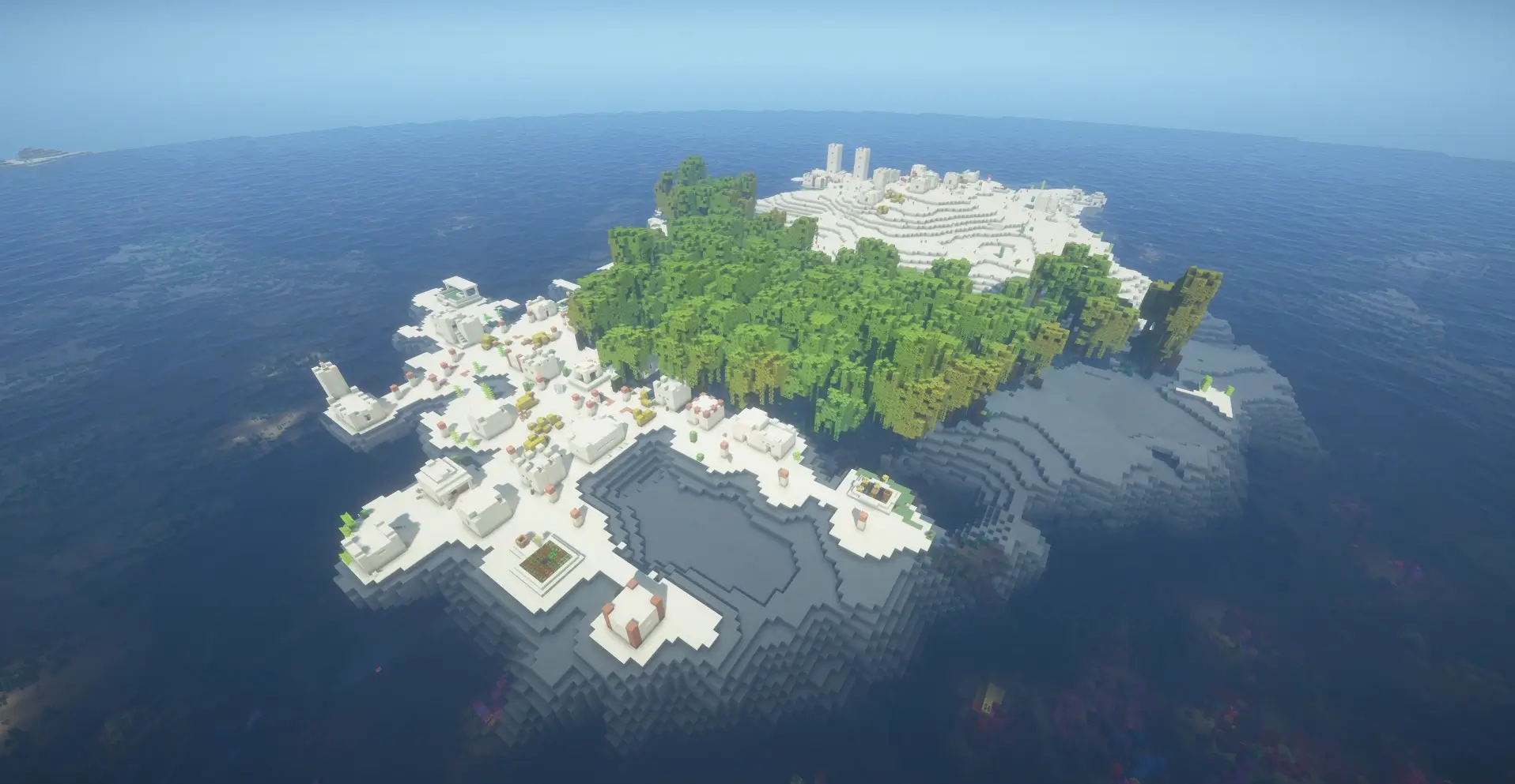 A rare island spawn with jungle and desert villages side by side in the ocean.