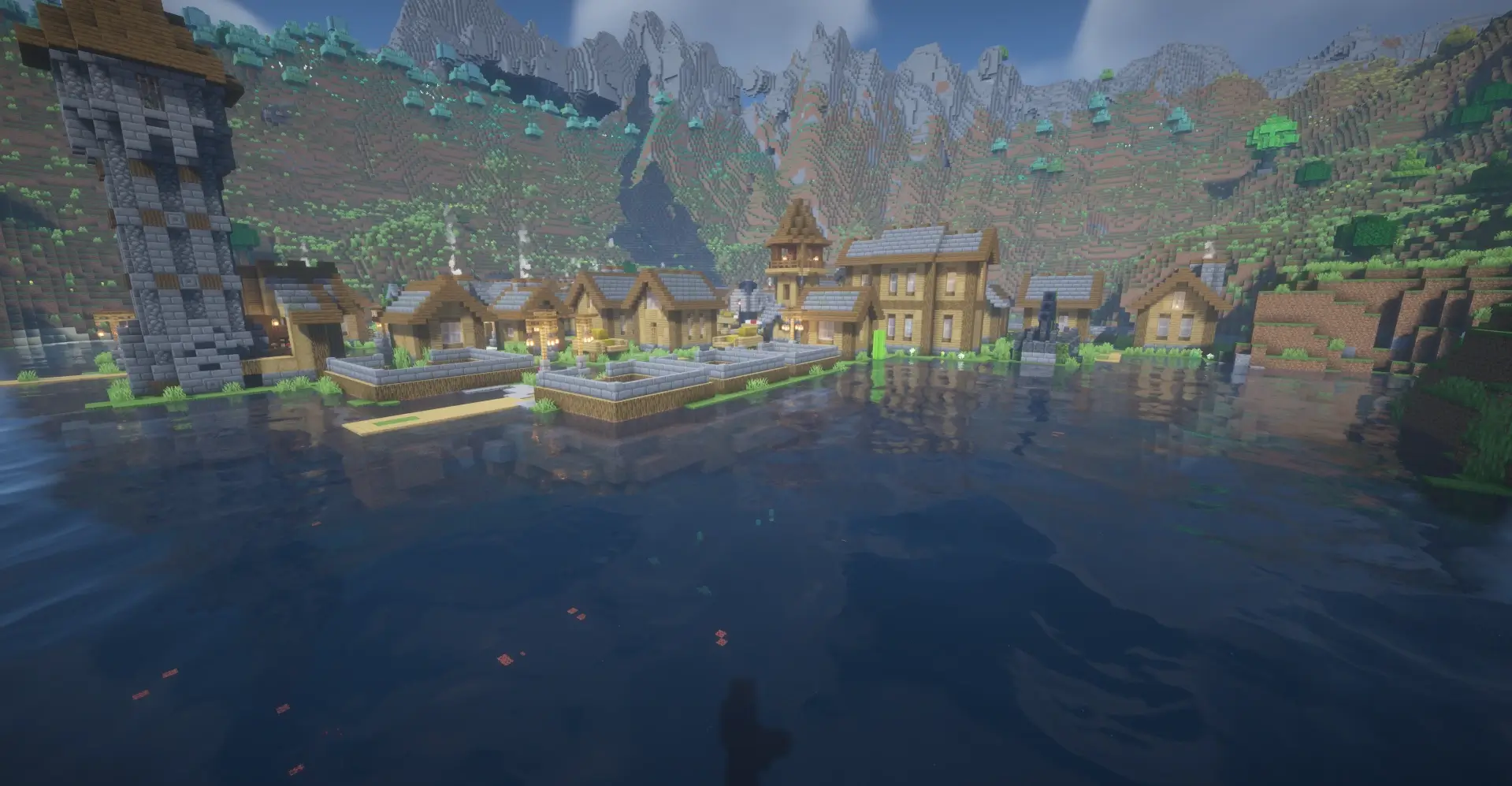 Large village built around a lake, surrounded by mountains and hills.
