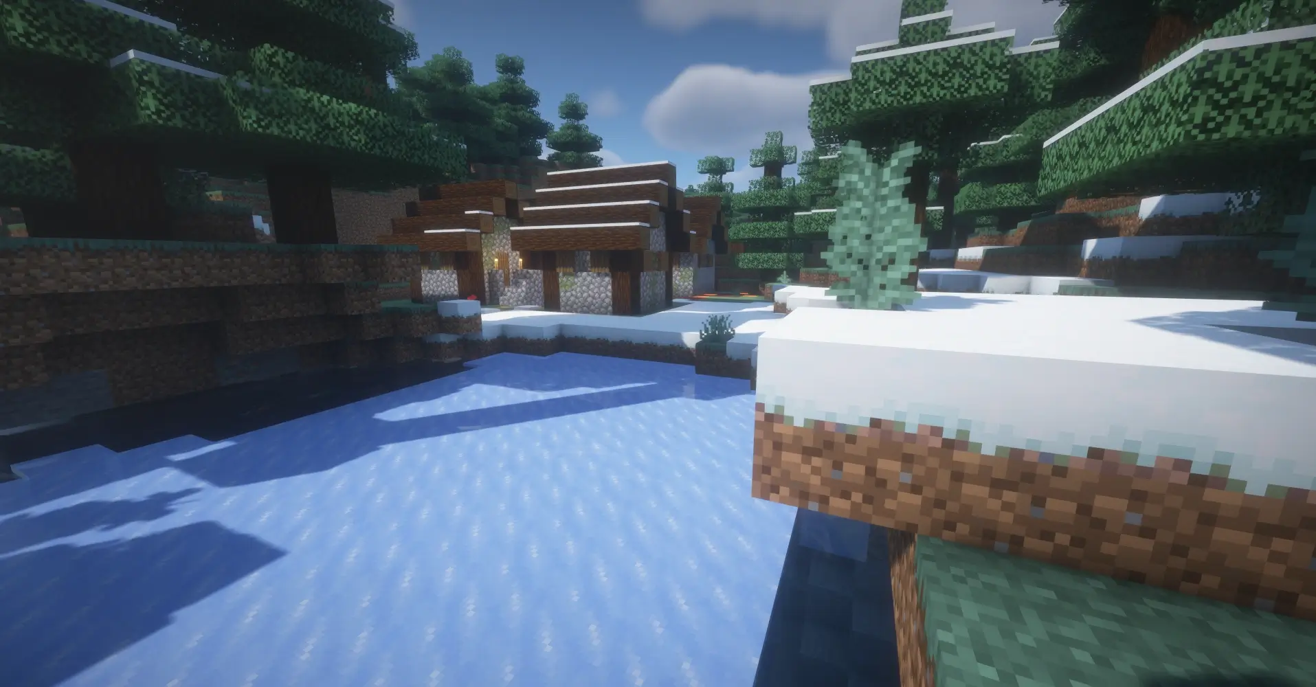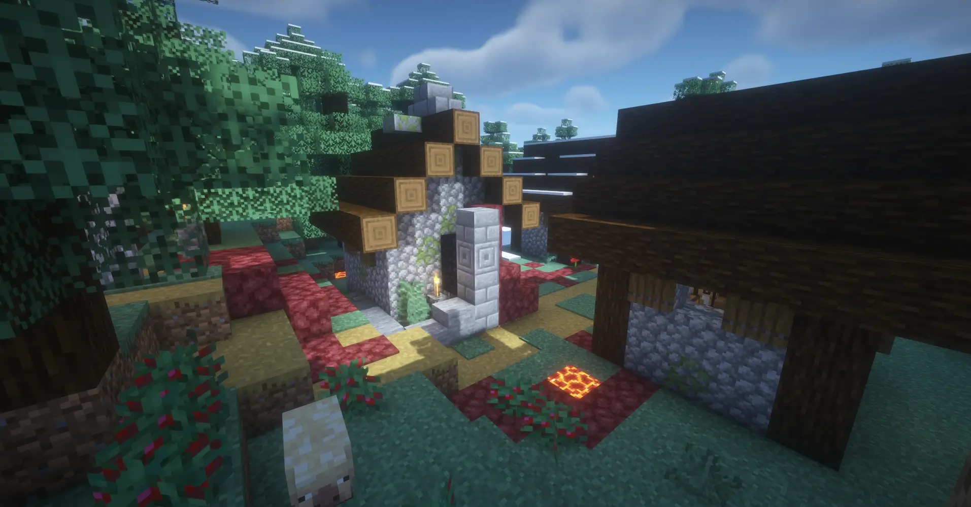 Taiga village near spawn where a ruined Nether portal merged into a house, with a Trial Chamber generated directly under the village. Perfect for early adventure and loot.