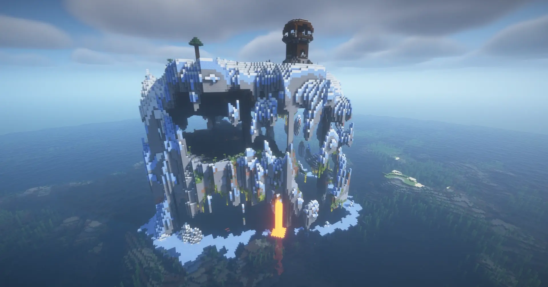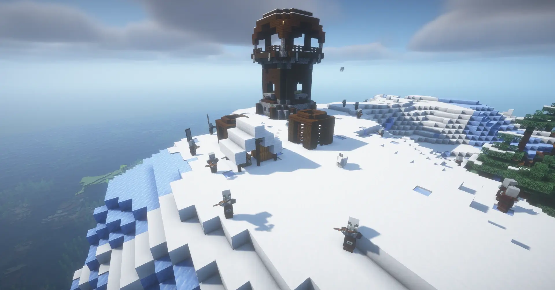 Tall wooden towers surrounded by tents and cages, home to Pillagers and Iron Golems in captivity. Defeat the banner-wearing captain to gain Bad Omen, which triggers raids near villages.