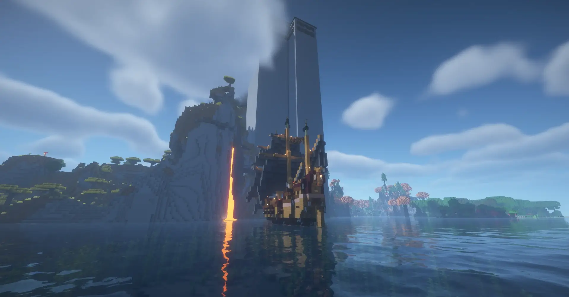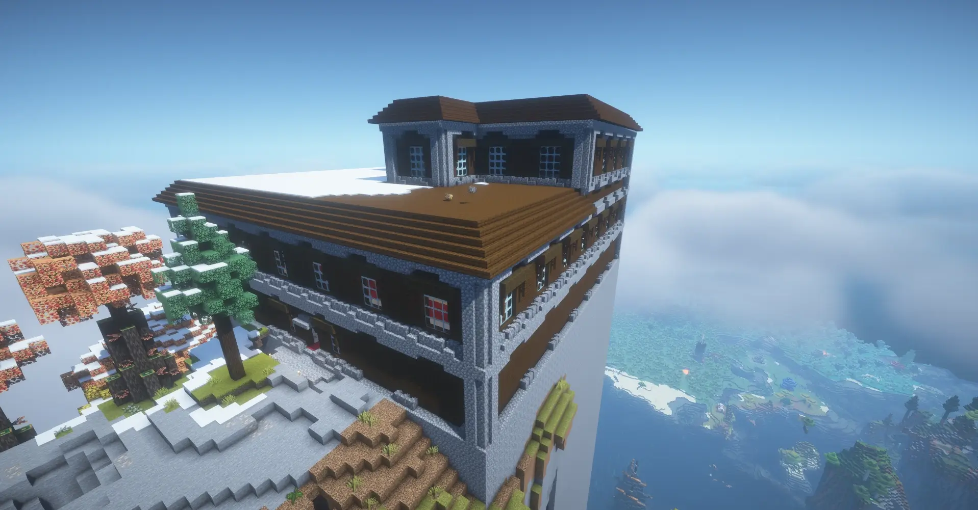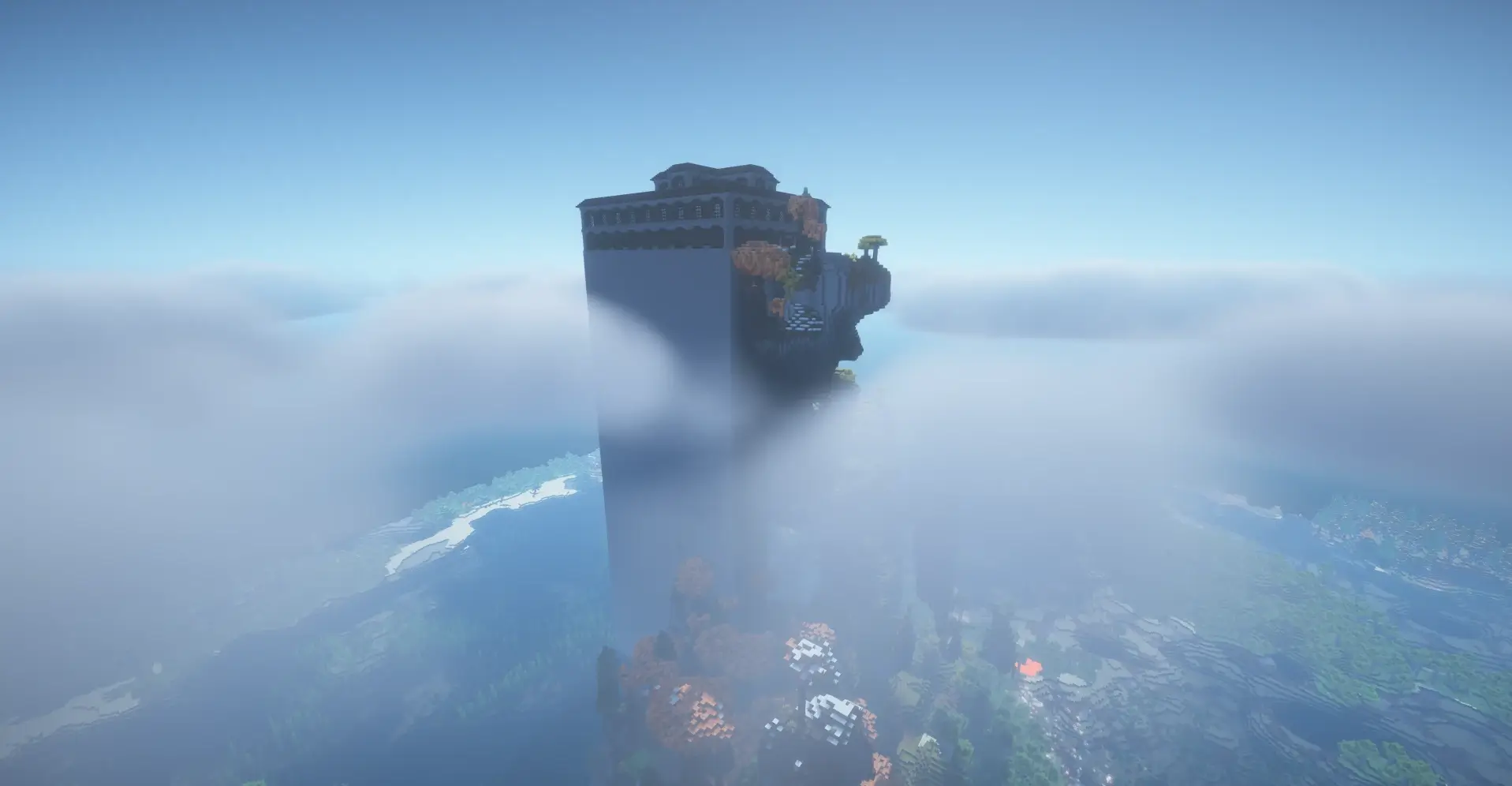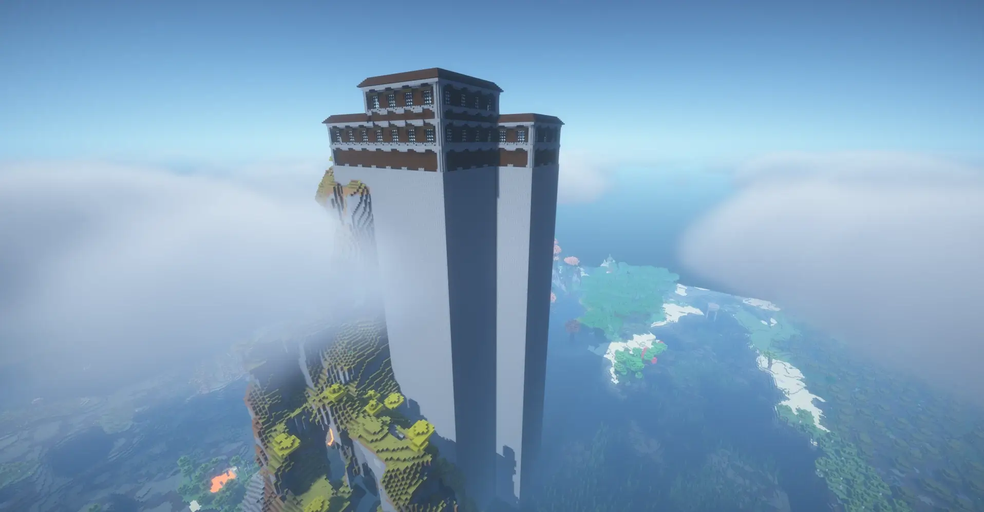 Massive sky-high tower with a mansion above clouds near cliffs and ocean.