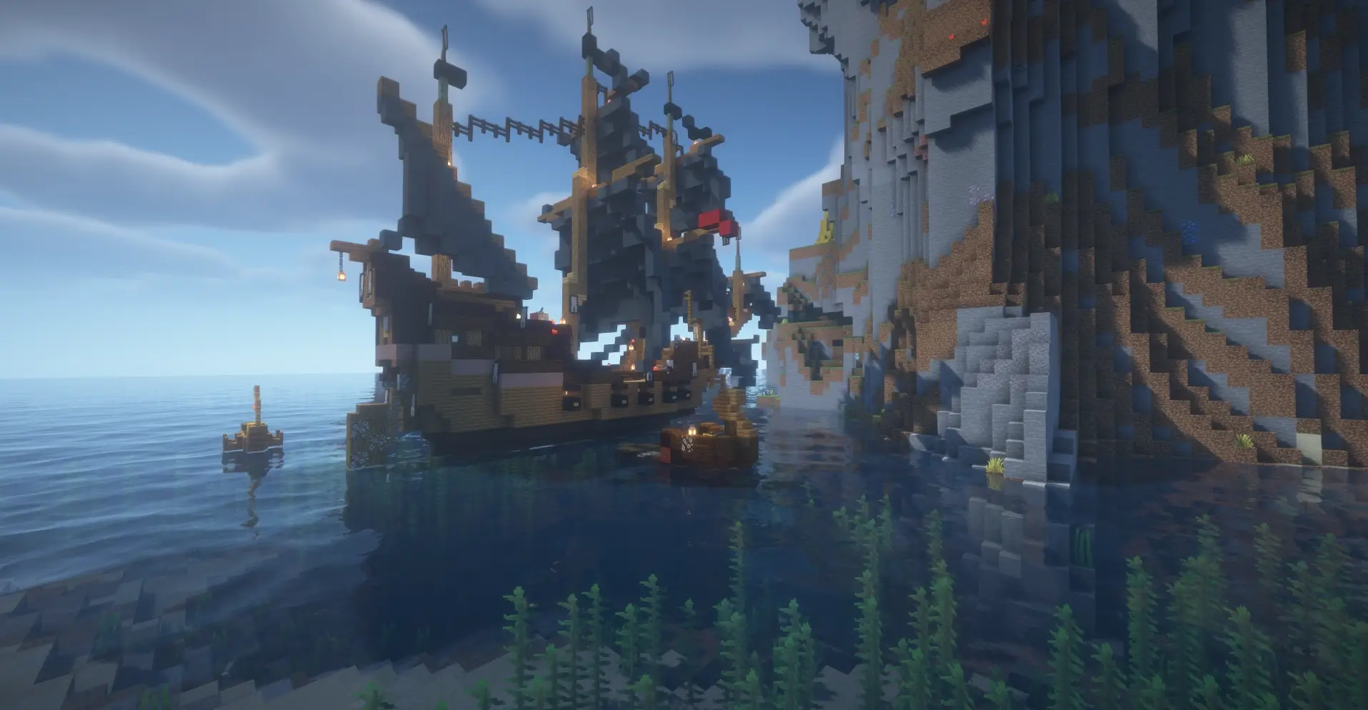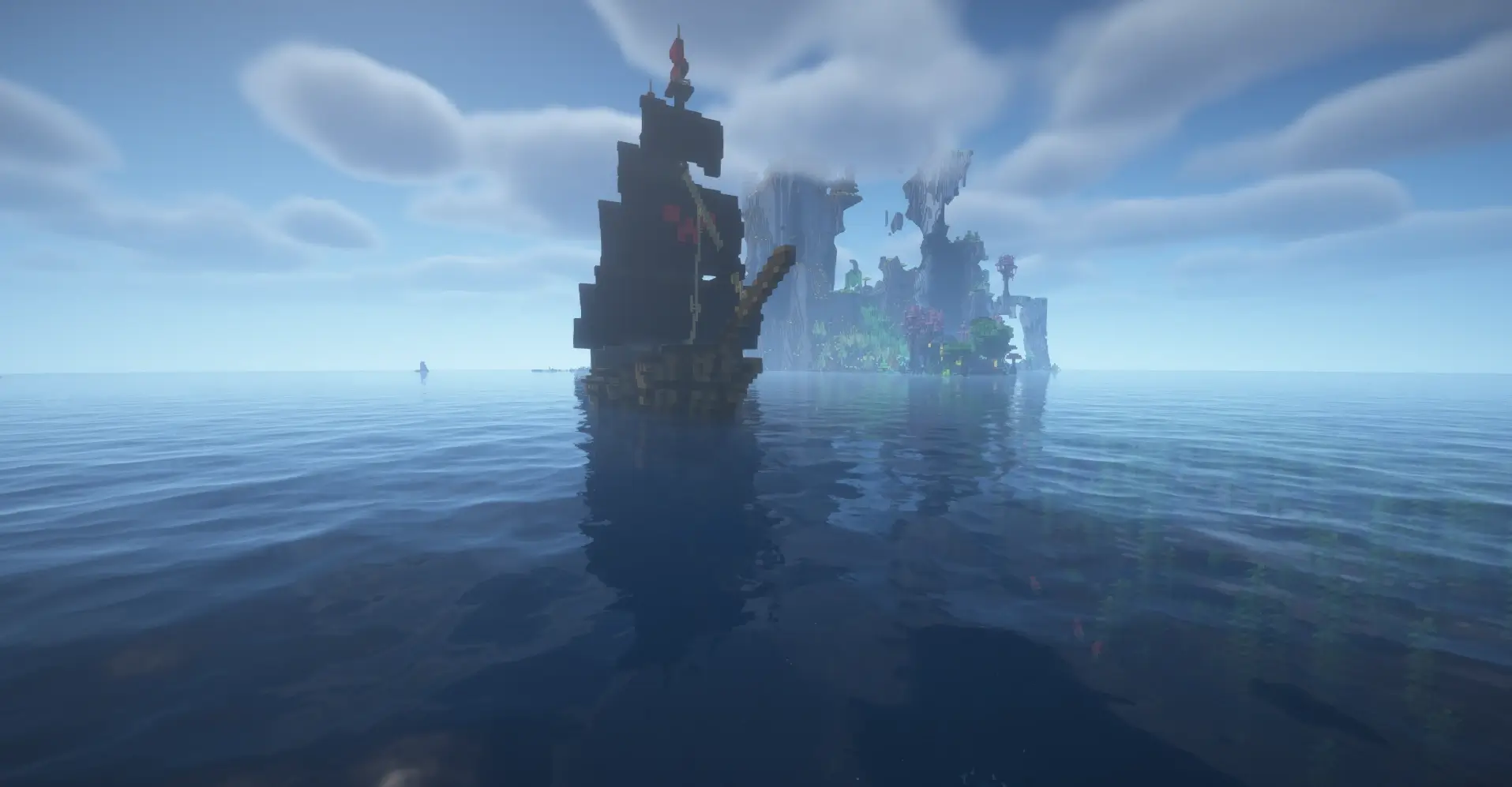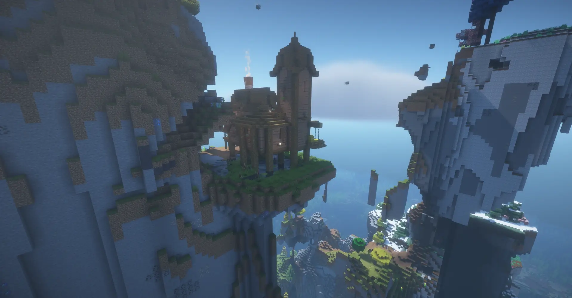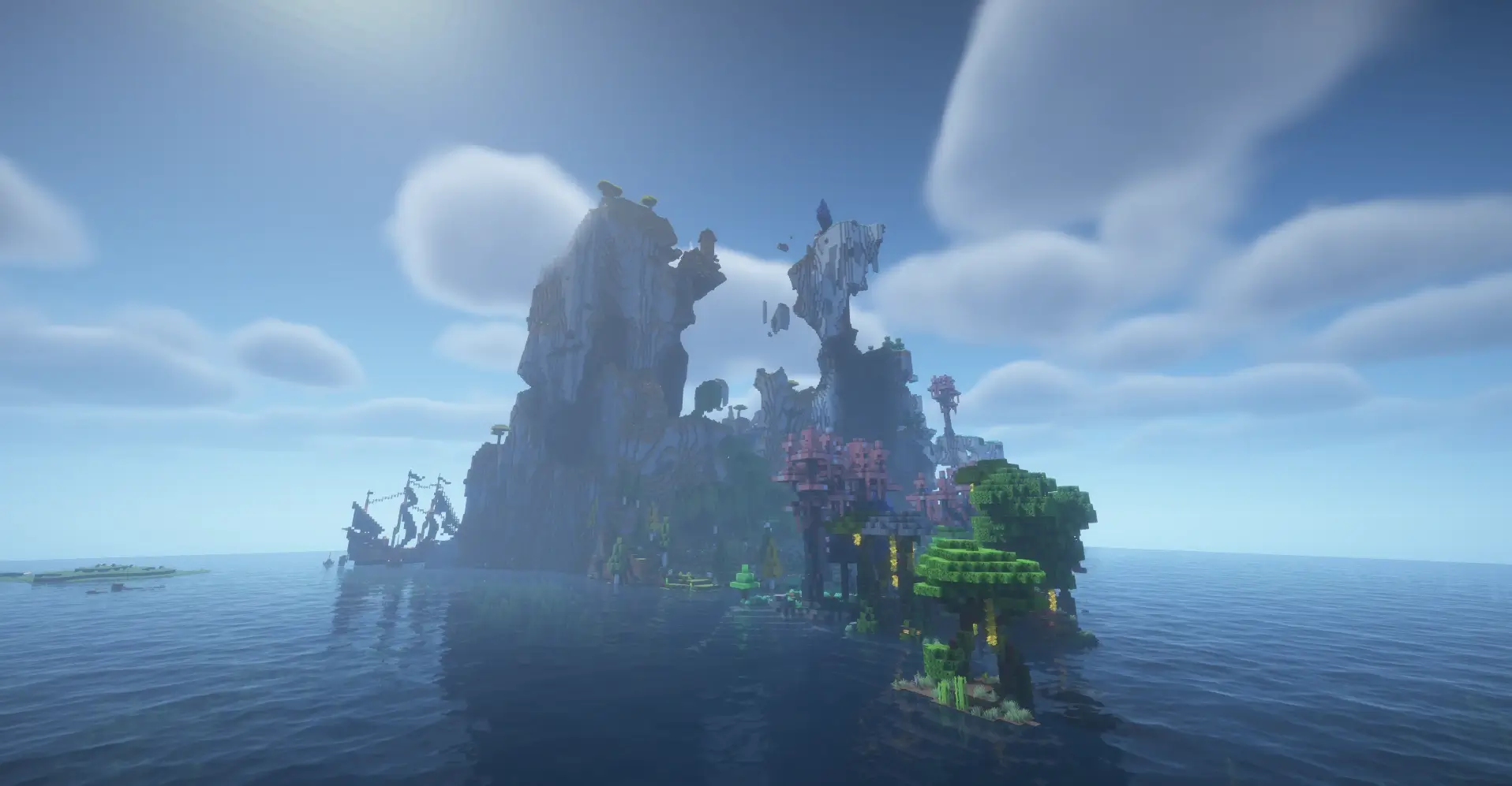 Spawn near a massive floating mountain island rising from the ocean, with ruins and ships nearby. Perfect for adventure, exploration and epic bases.