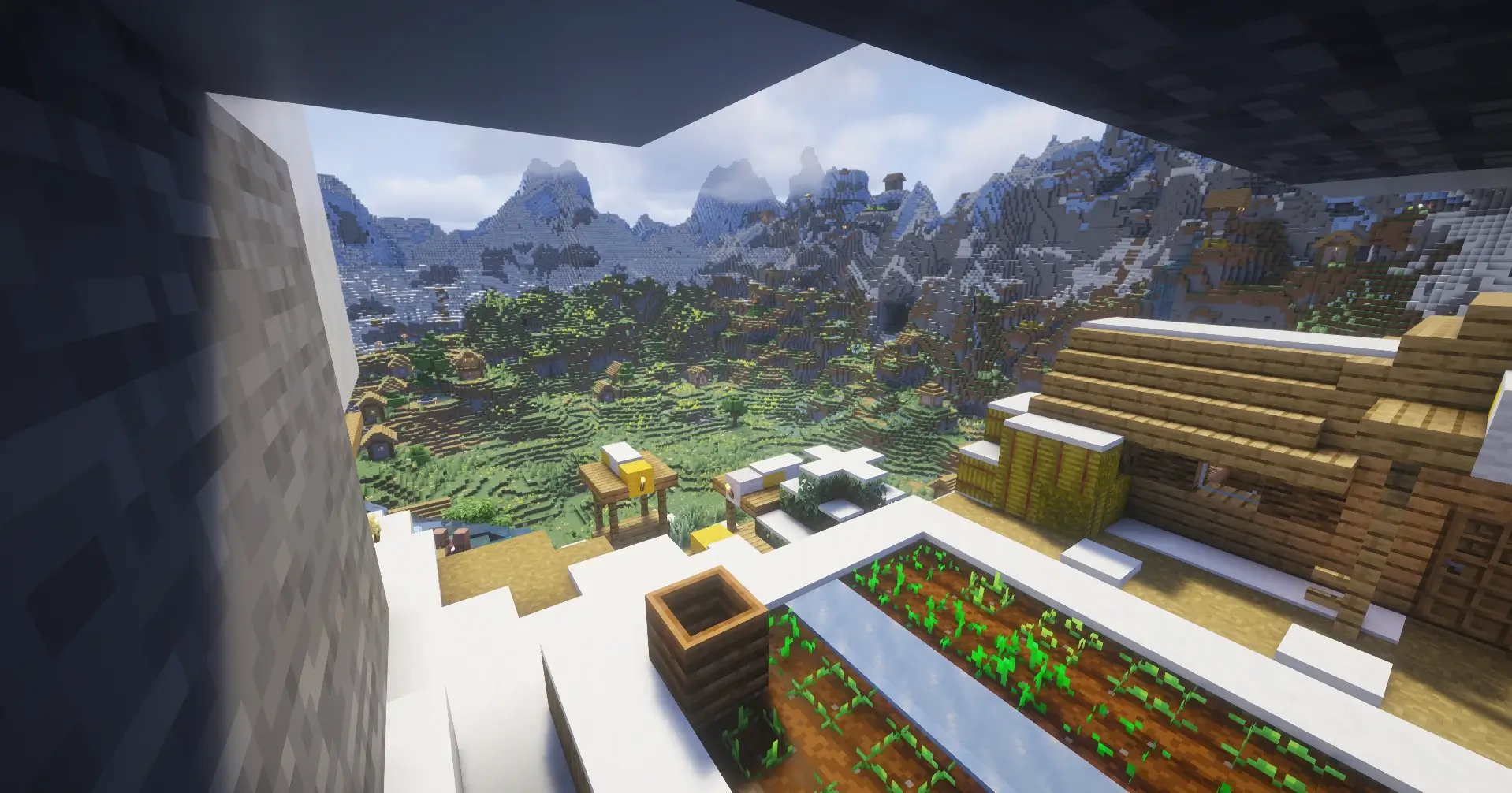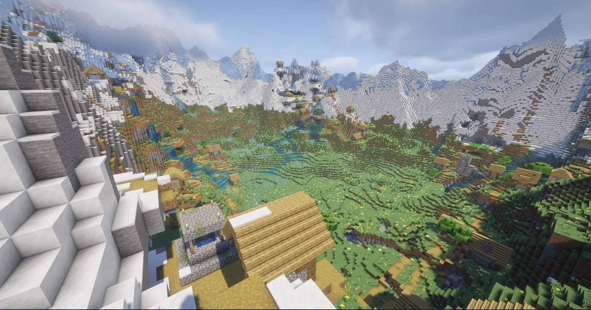 A stunning mountain valley seed with snowy peaks surrounding a wide green plains biome. Multiple villages are spread across the valley, connected by rivers and natural paths, making it easy to trade and expand early. A perfect scenic start that feels alive and stays interesting for long-term survival.