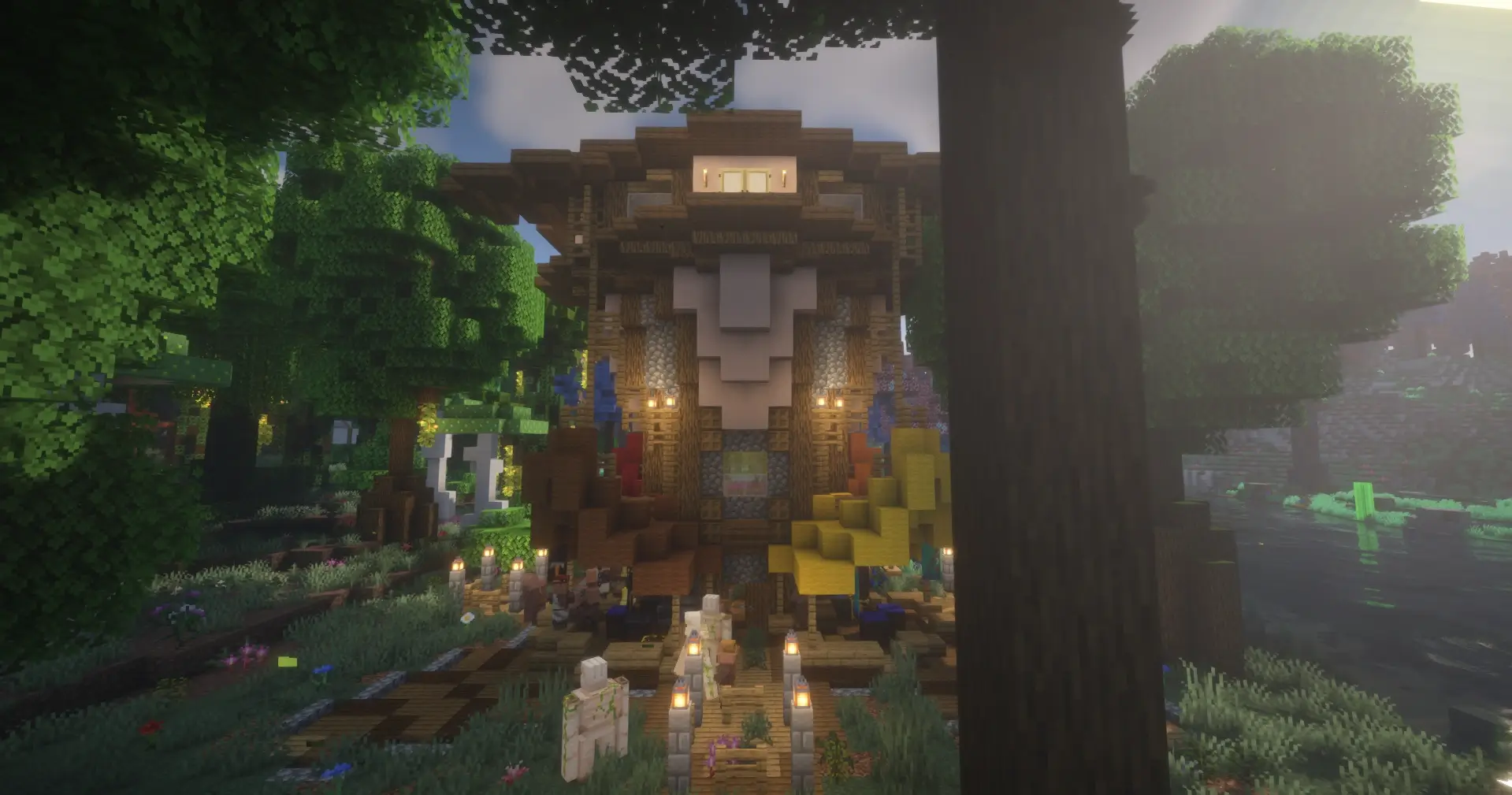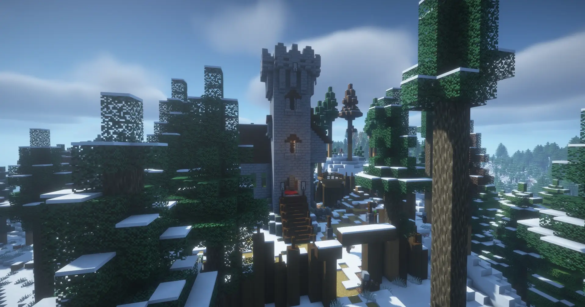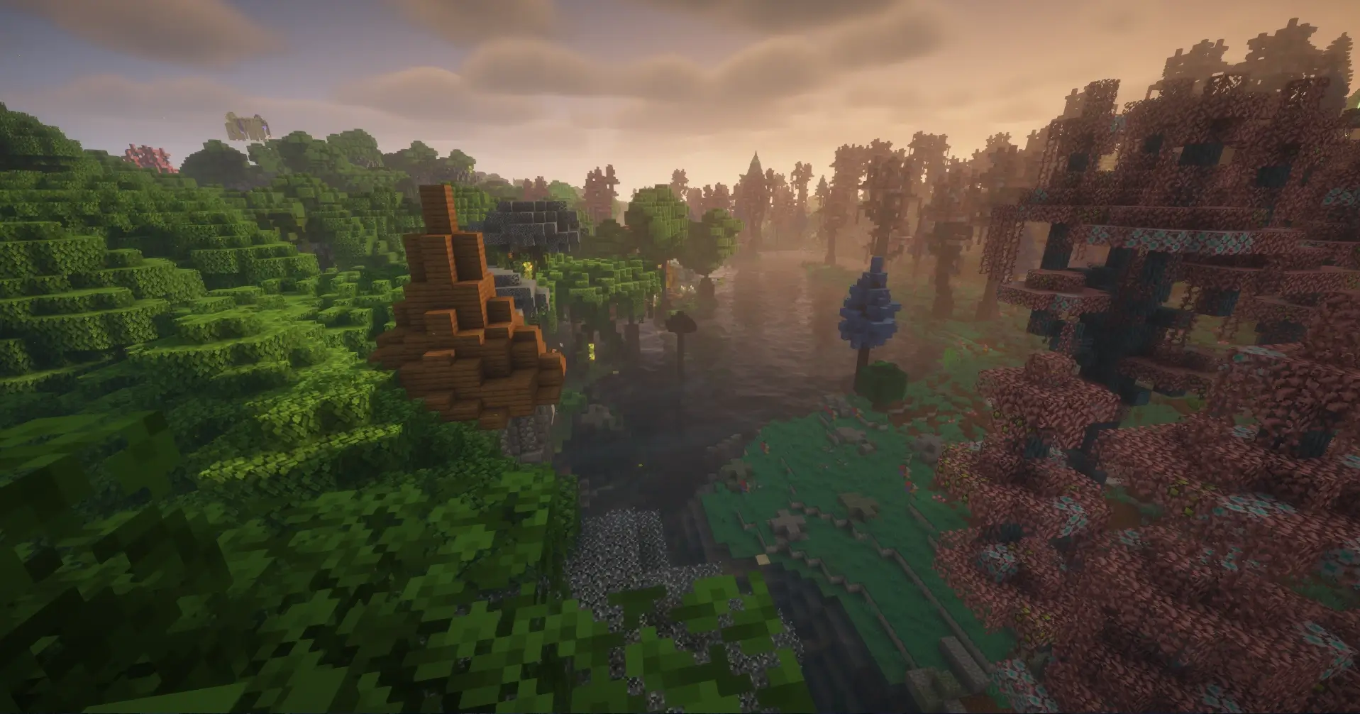 This seed features a breathtaking convergence of diverse biomes, showcasing a dramatic transition from a dense snow-covered taiga to a vibrant, colorful cherry blossom forest. The landscape is further enhanced by atmospheric shaders, revealing a massive, winding river valley and distant mountain peaks that provide a perfect canvas for large-scale fantasy builds.