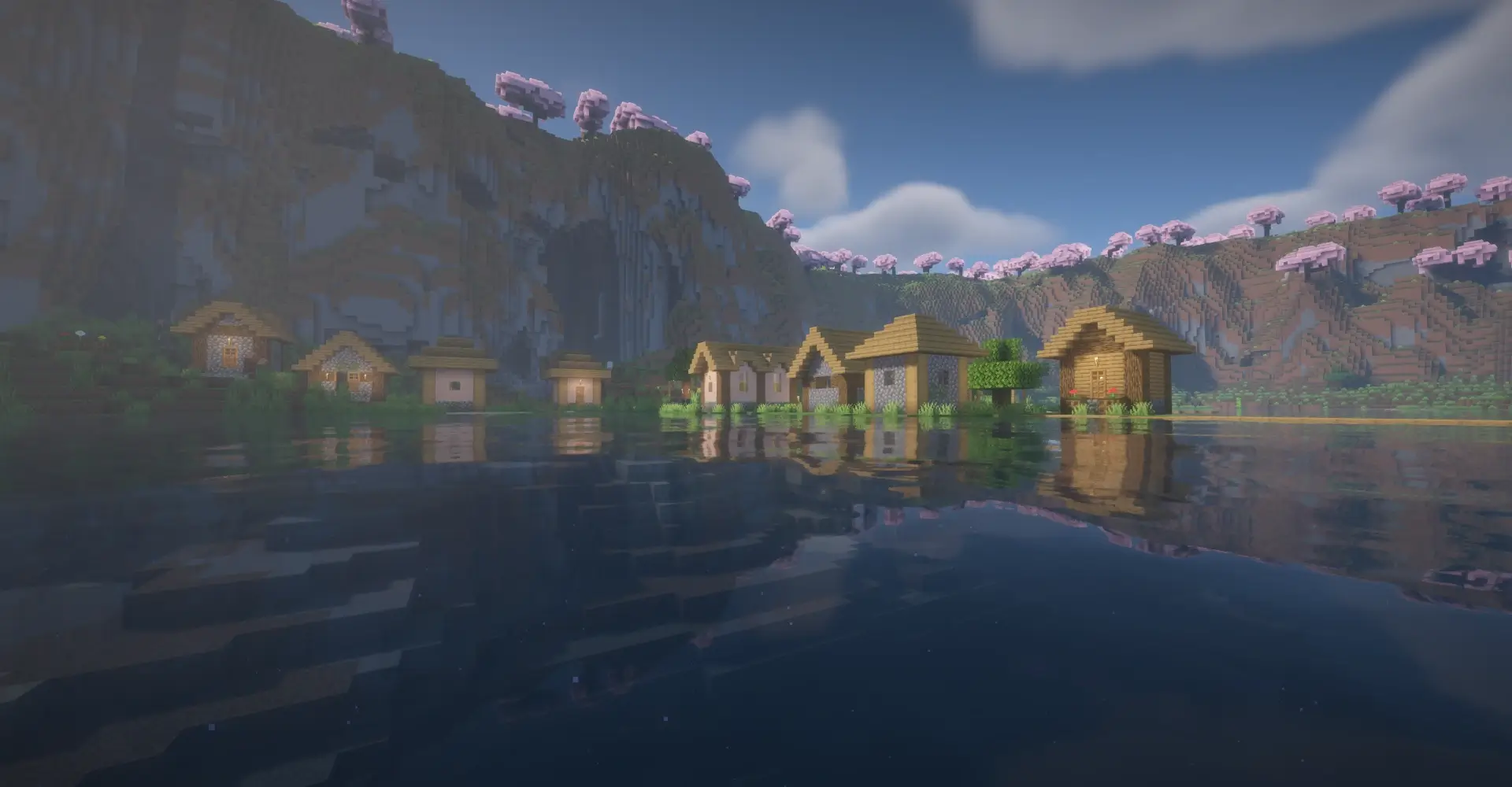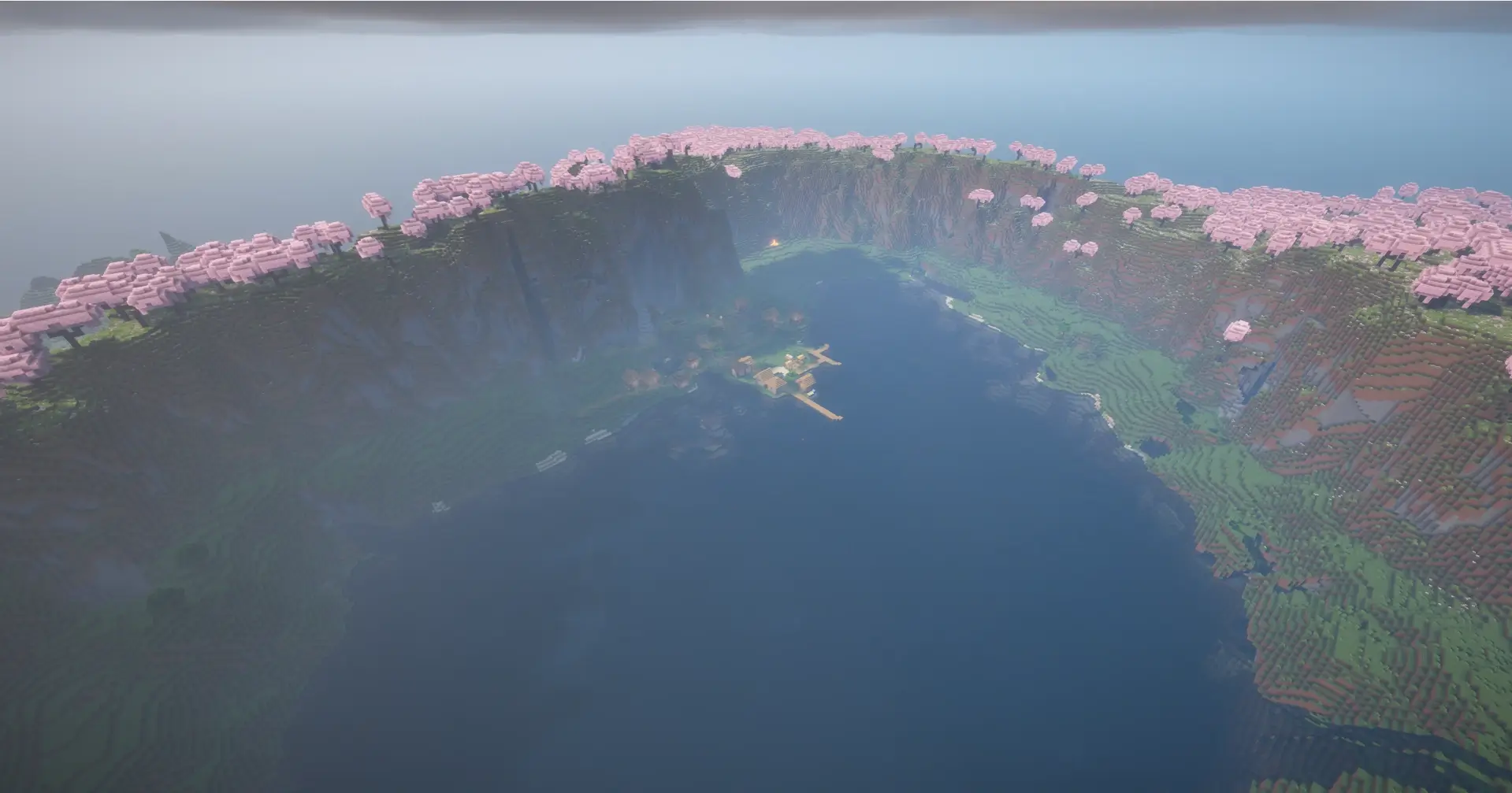 This incredible seed features a peaceful Plains Village tucked away at the bottom of a massive, circular mountain basin filled with a deep blue lake. The entire crater is crowned with a dense ring of Cherry Blossoms, creating a protective pink wall that separates this hidden settlement from the rest of the world. It is the ultimate location for a "hidden paradise" build, offering a perfect blend of high-altitude beauty and cozy valley living.