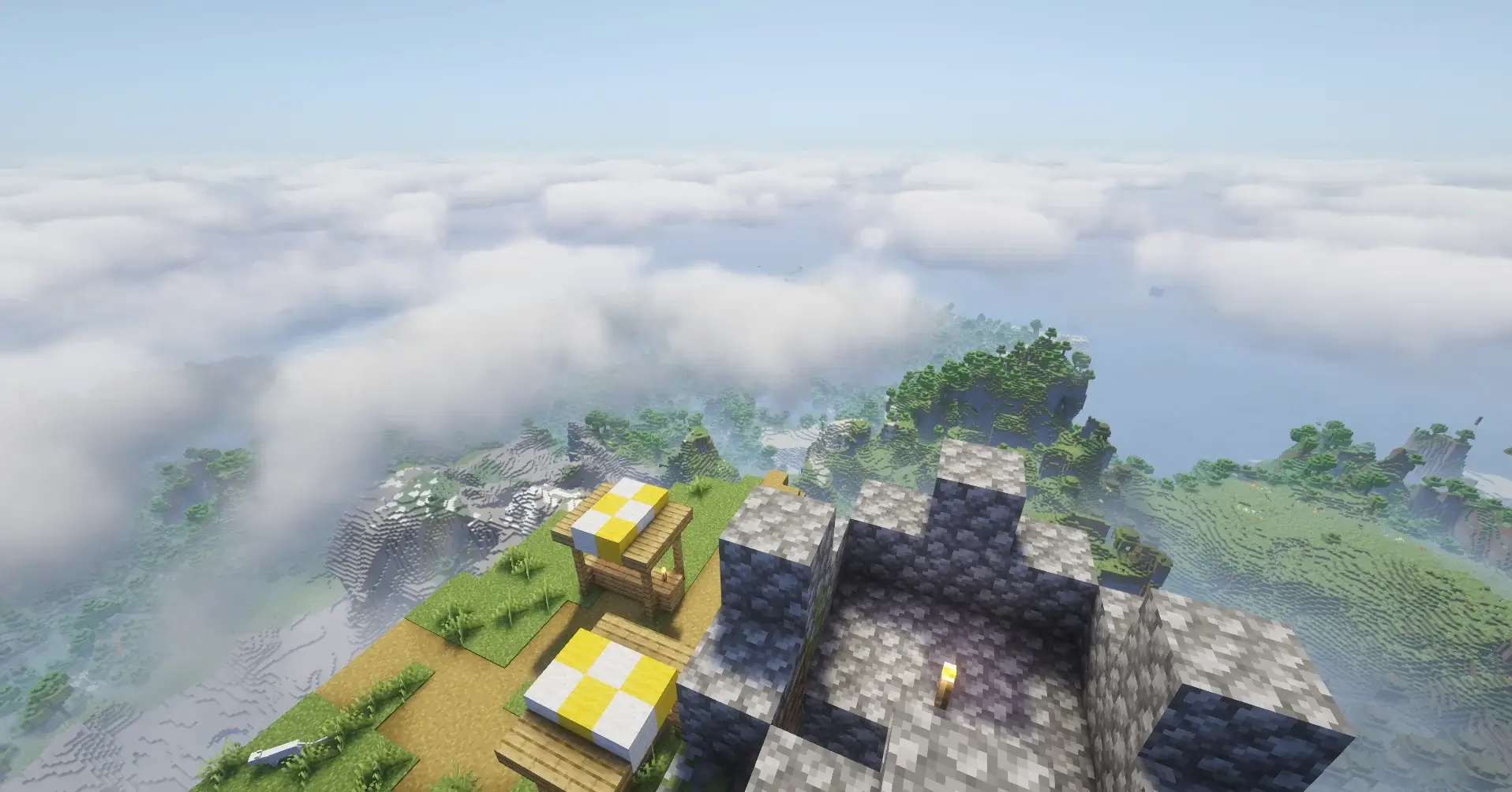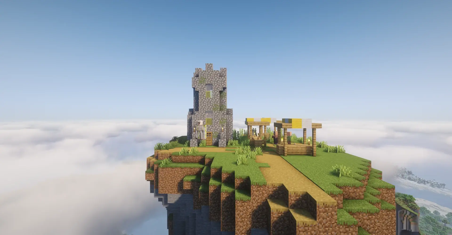 A towering sky island rising above the clouds, with a small village and a ruined tower on its flat top. Completely isolated from the land below, it feels like a natural fortress in the sky. A perfect seed for a hardcore or creative survival start with epic views.