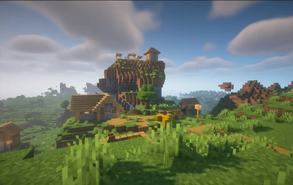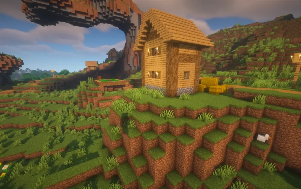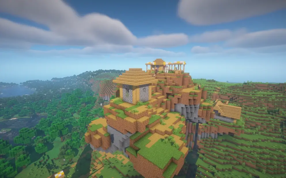 Explore a world where gravity seems like a suggestion, featuring a village perched atop breathtaking overhanging cliffs and massive stone arches. This unique seed offers dramatic verticality and incredible scenic overlooks, making it the ultimate destination for builders who want to create a hanging mountain city.