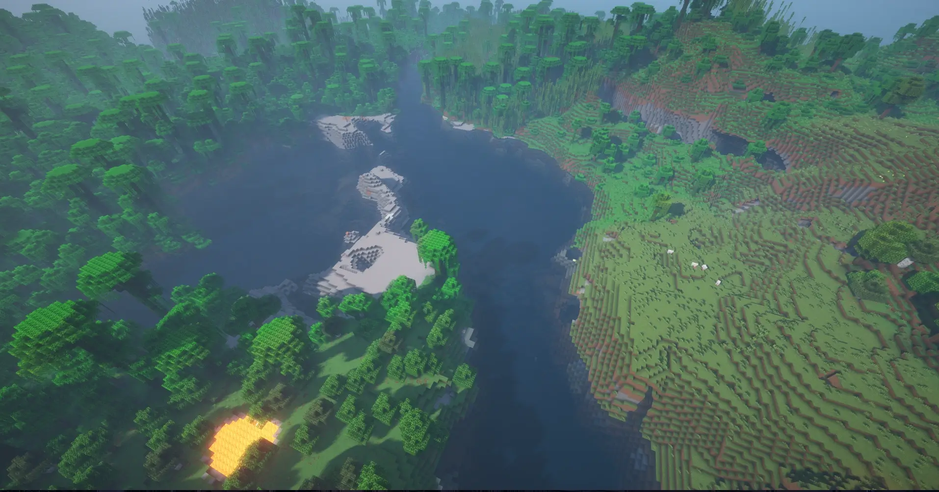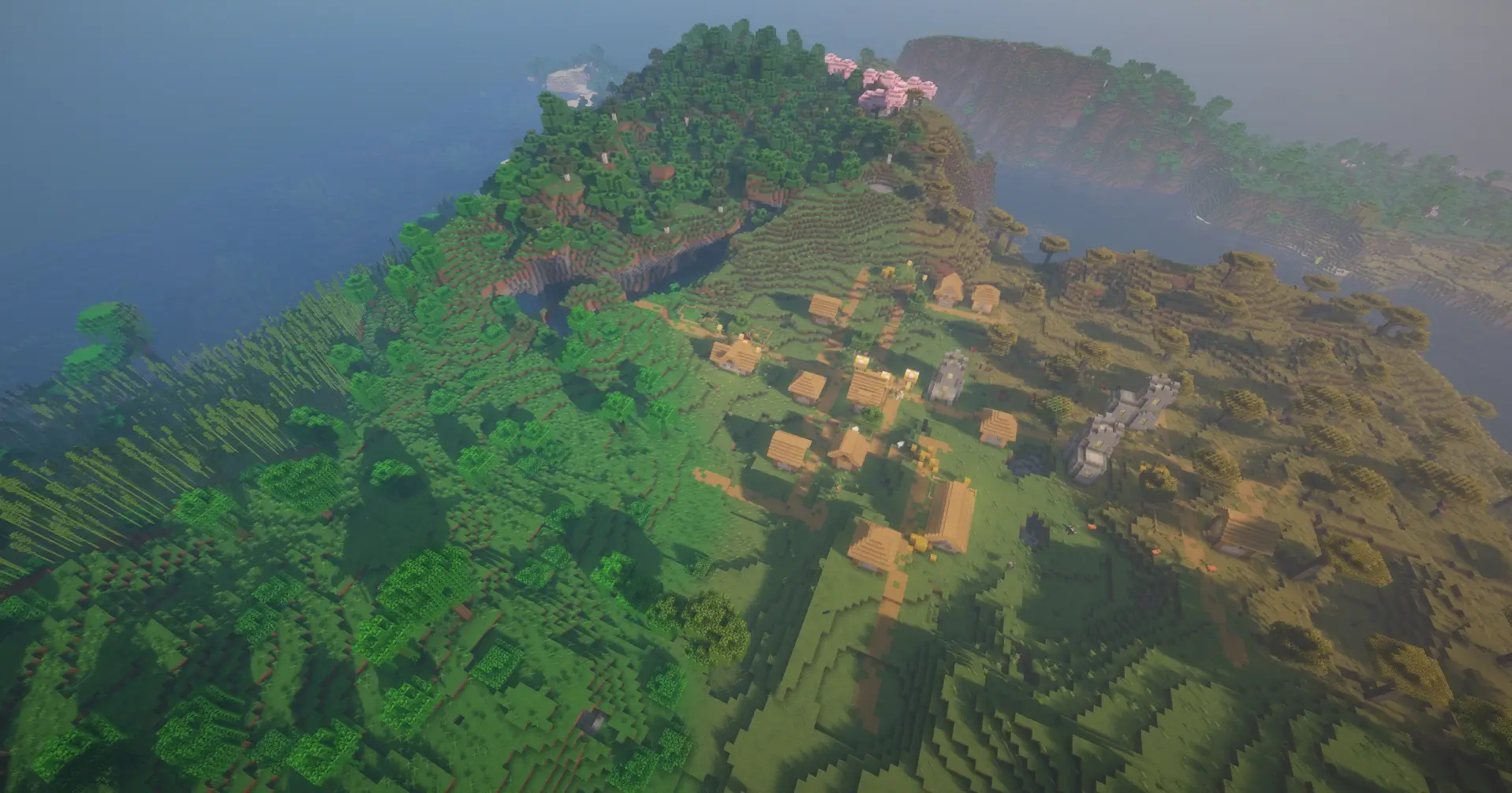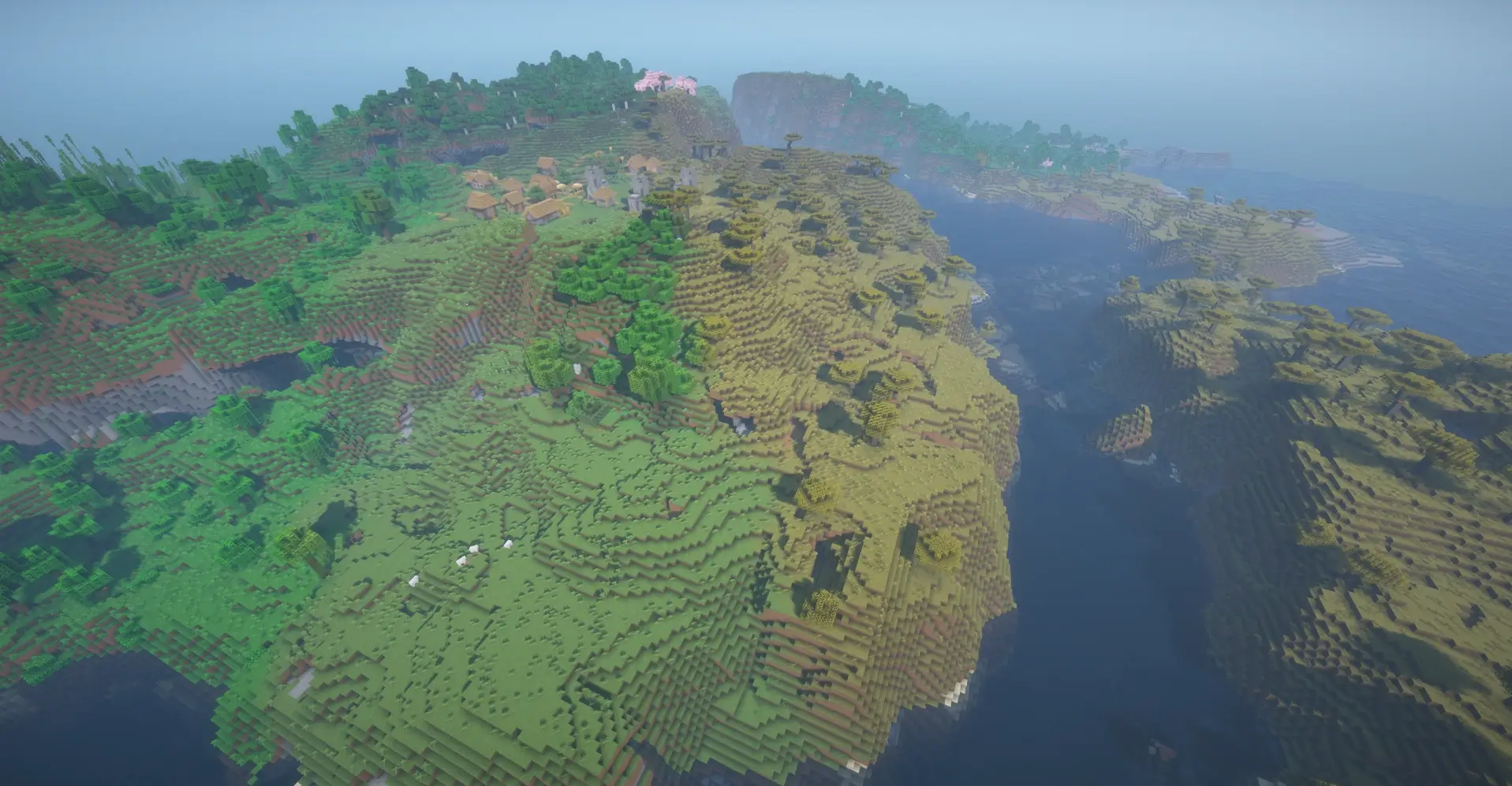 This unique seed features a cozy village nestled at the stunning intersection of Jungle, Savanna, and Plains biomes. The lush tropical greenery meets rolling golden hills, offering a picturesque landscape perfect for building a hillside retreat with a view of the distant ocean.