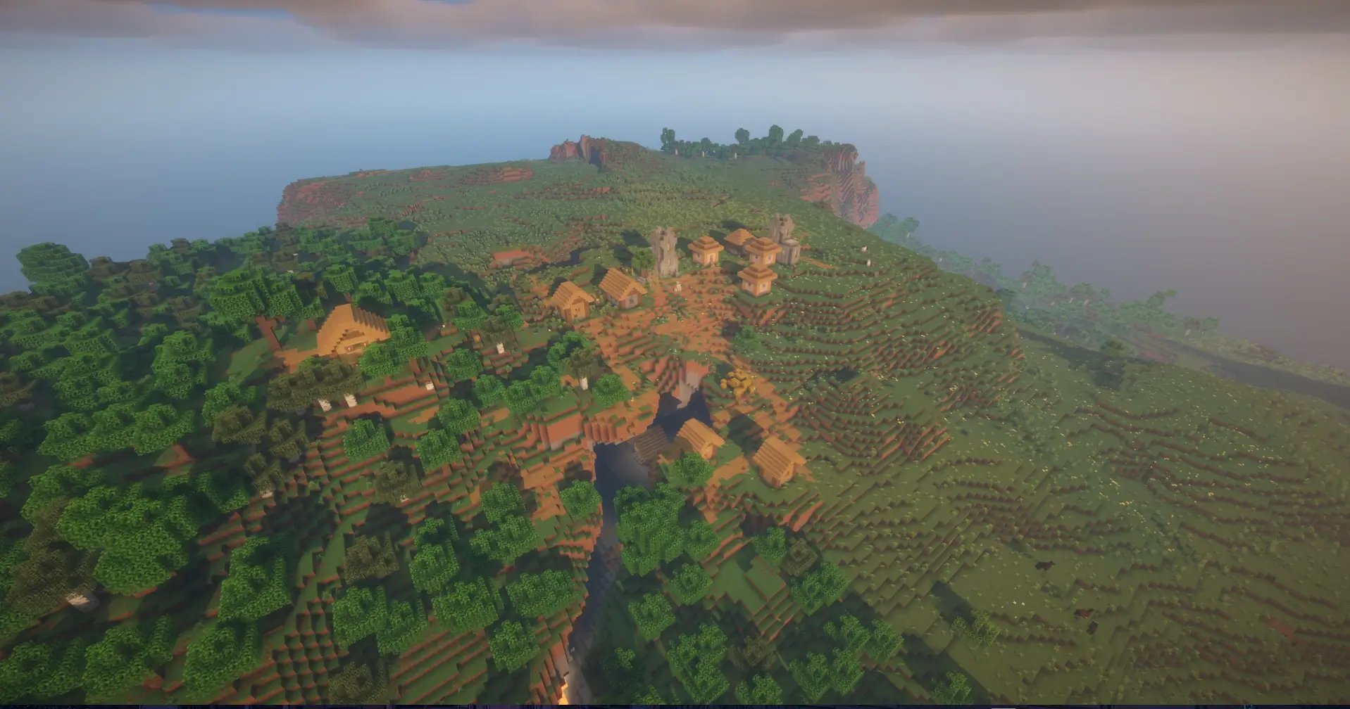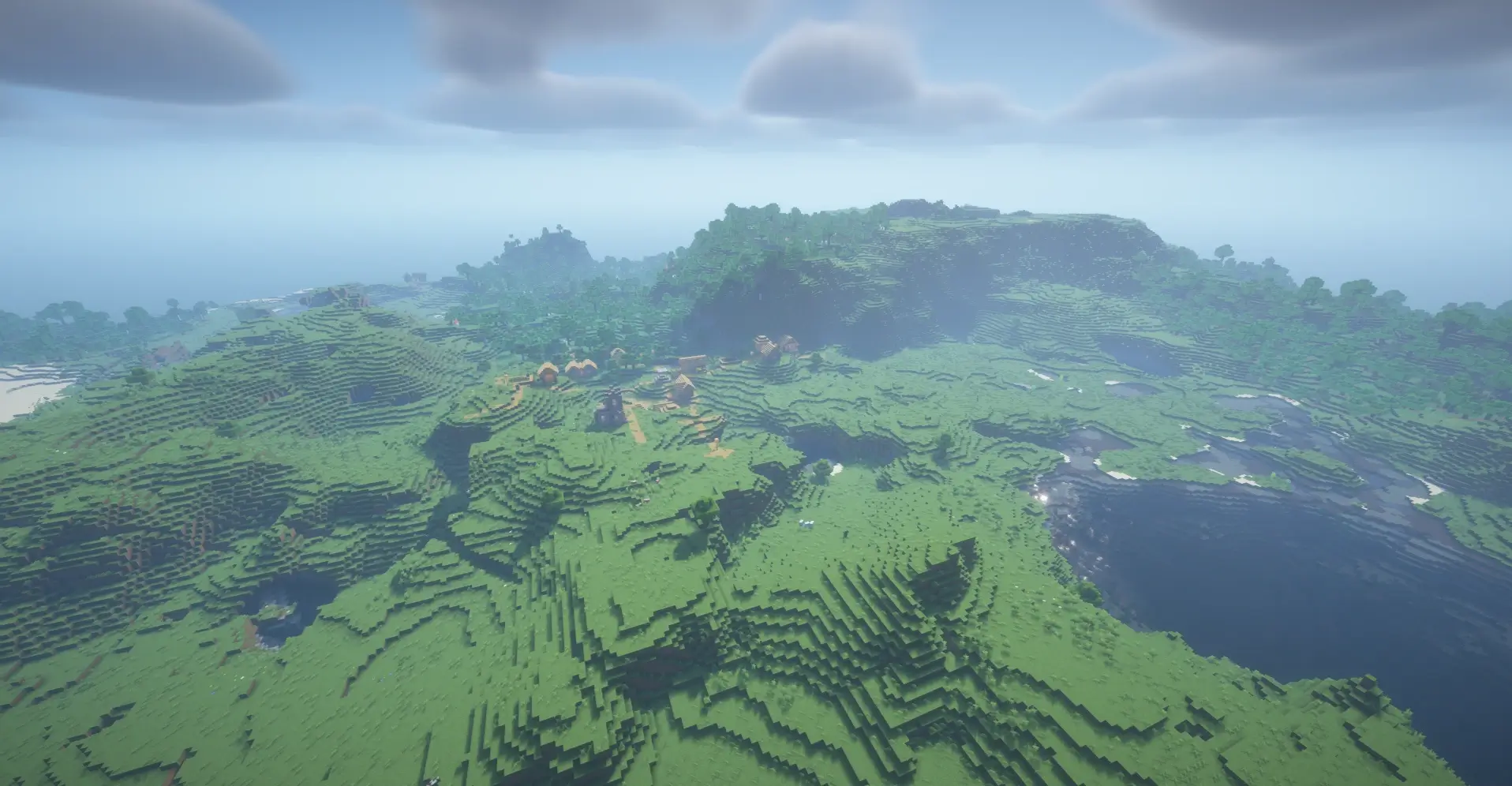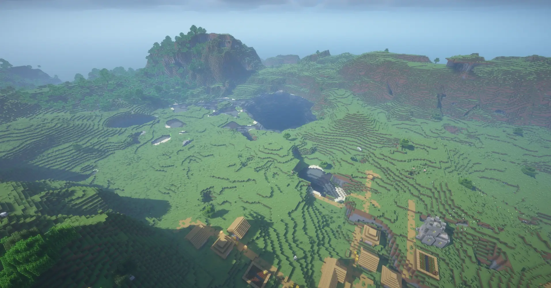 This seed generates a wide green plains valley with lakes and rolling hills, perfect for building and exploration. Nearby you can find three villages close to each other and a Woodland Mansion hidden in the nearby forest, offering great loot and a challenging adventure. It’s a perfect seed for survival with easy resources and exciting structures