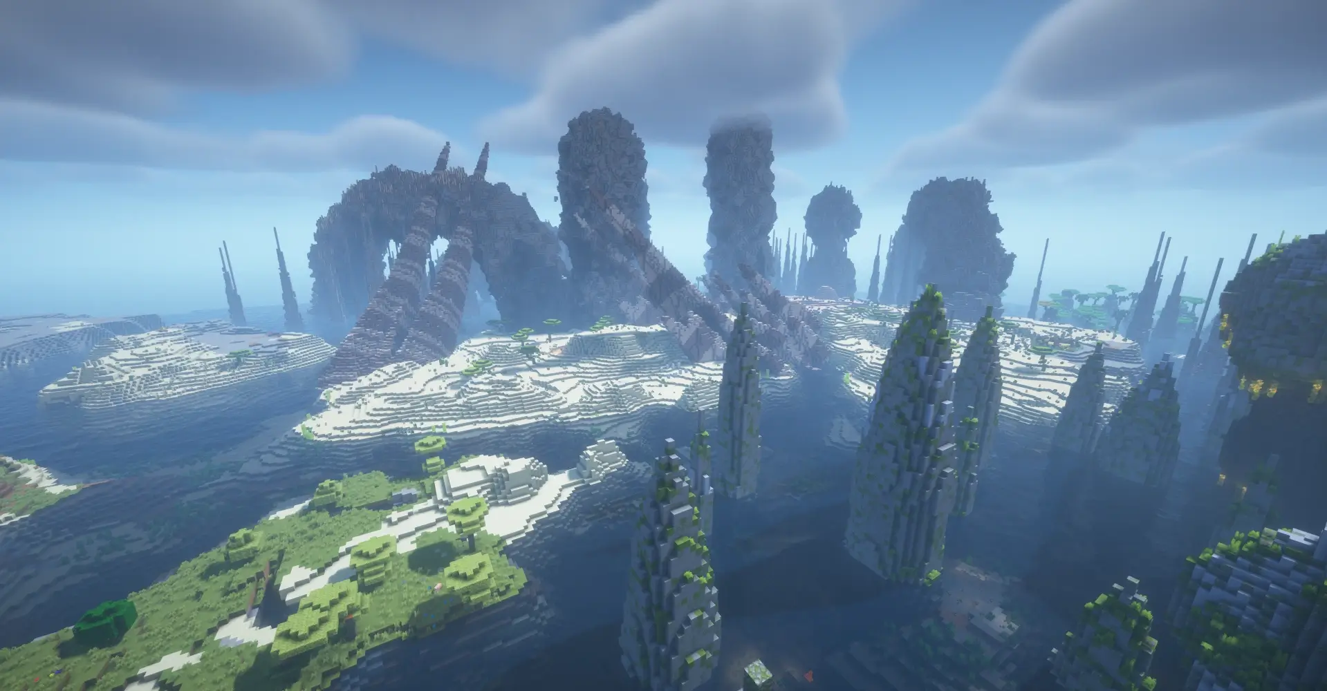 This seed drops you into a massive ocean filled with towering stone pillars and giant natural arches, creating a dramatic and mysterious landscape. Hidden caves and deep waters make it perfect for exploration, base building, and adventure in ATM10. The huge structures and open sea give it a unique, almost ancient-world feeling right from spawn.