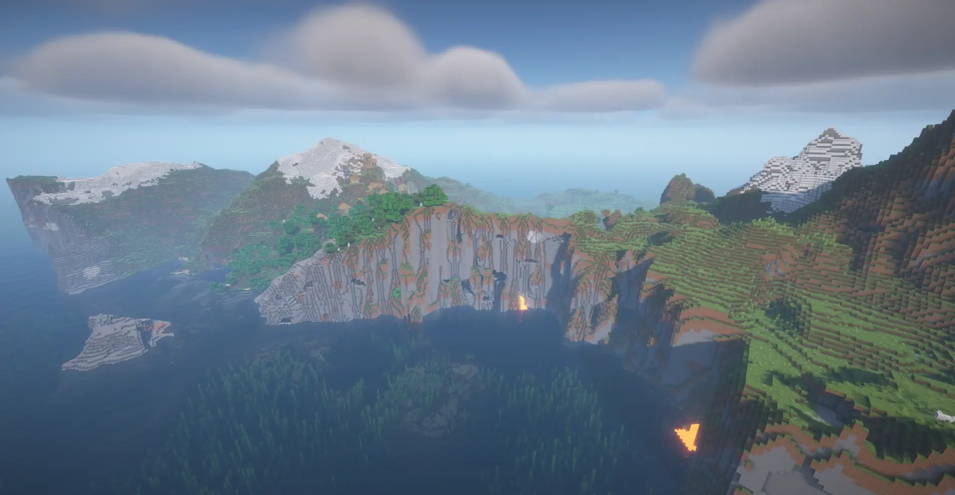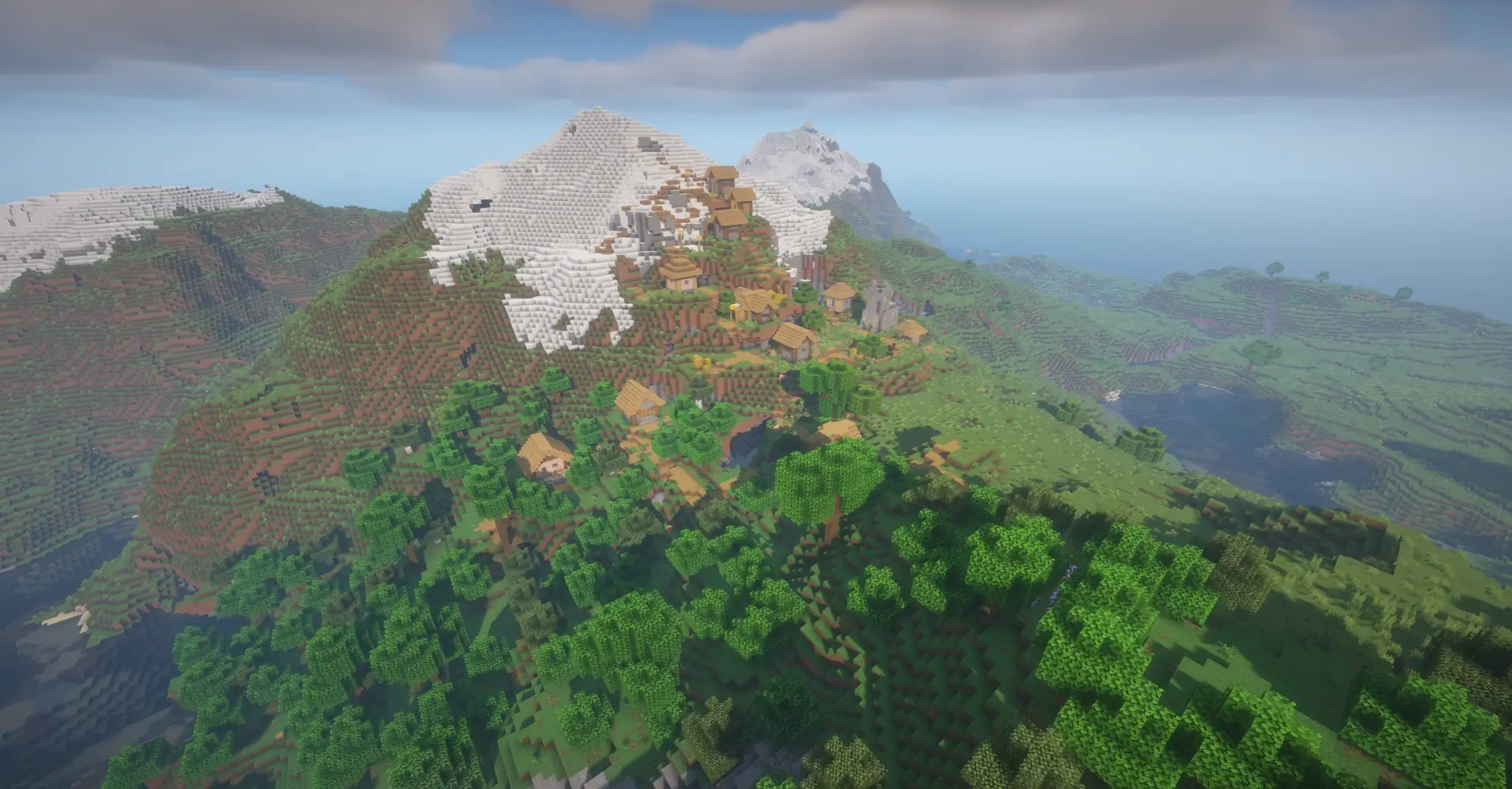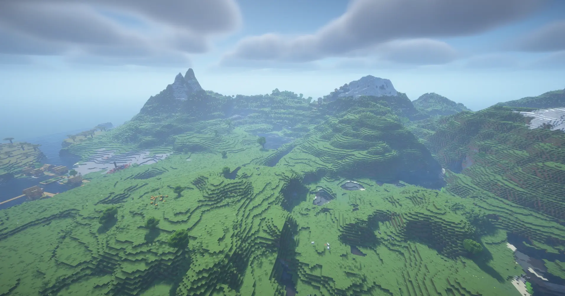 Beautiful plains valley with twin peaks and wide open land perfect for building. Three villages spawn nearby, giving easy resources and a great survival start.