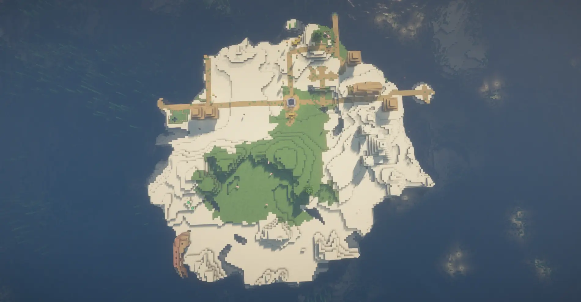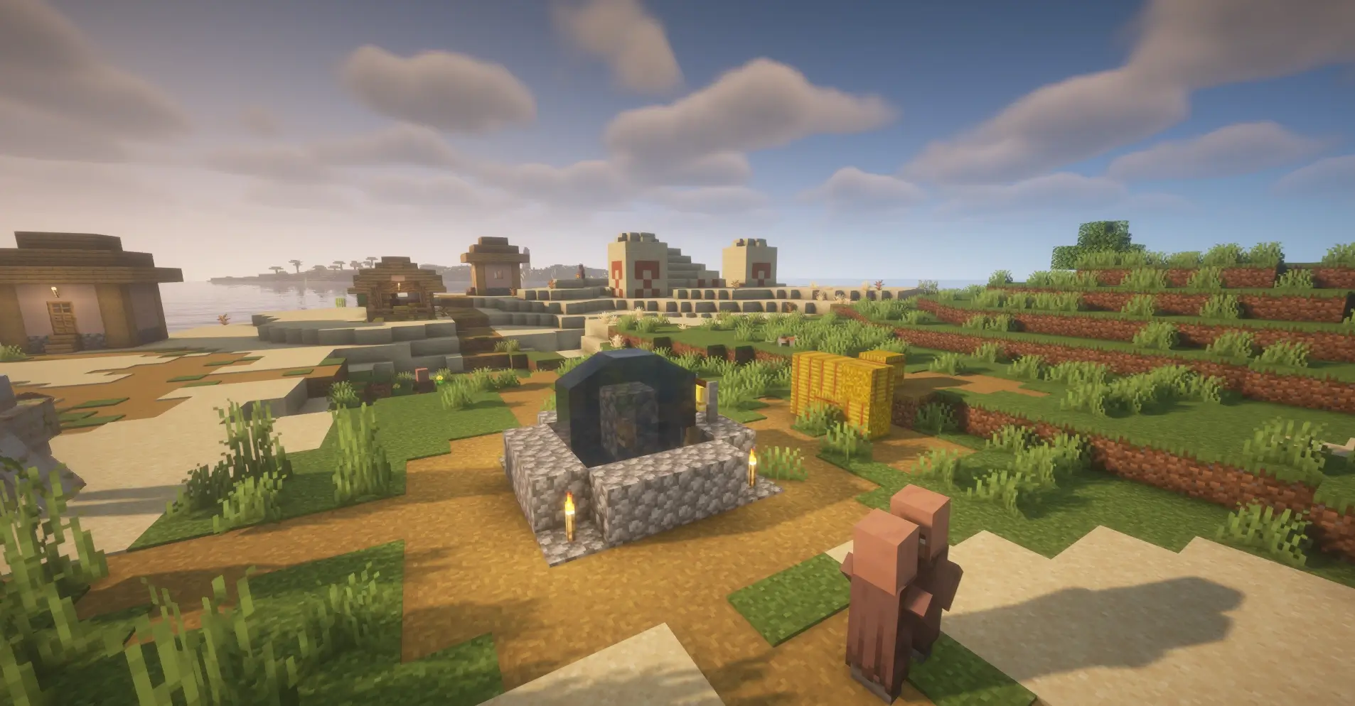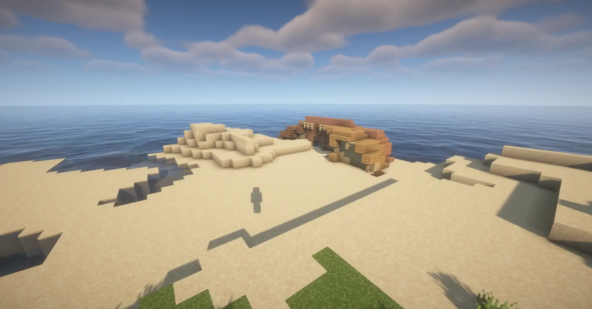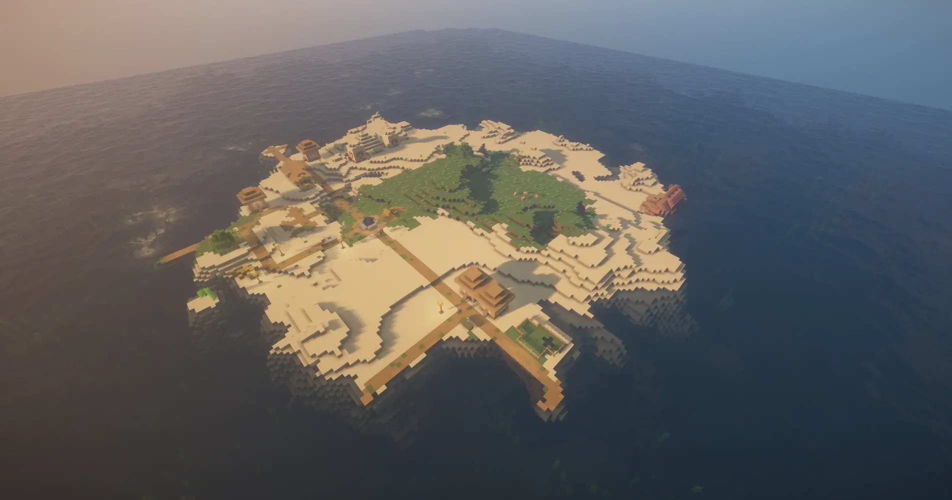 Start on a rare spawn island with a village and desert temple, offering quick loot and an easy survival setup.