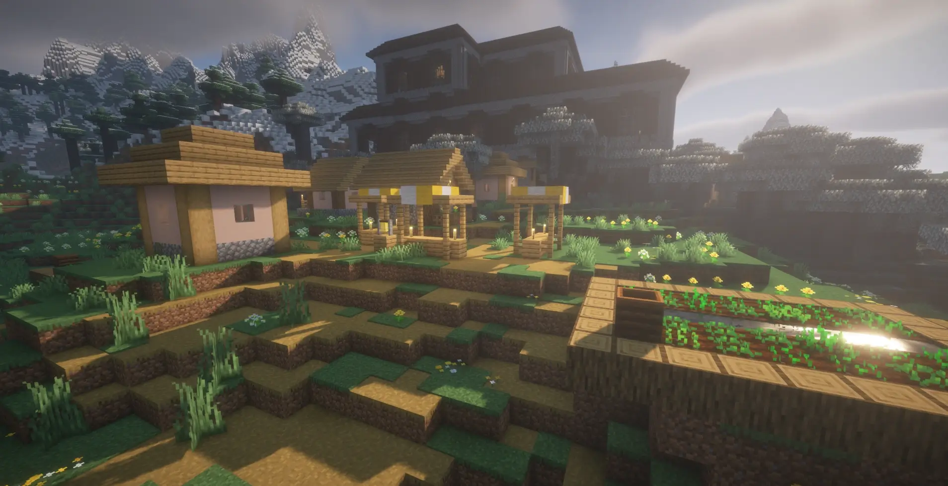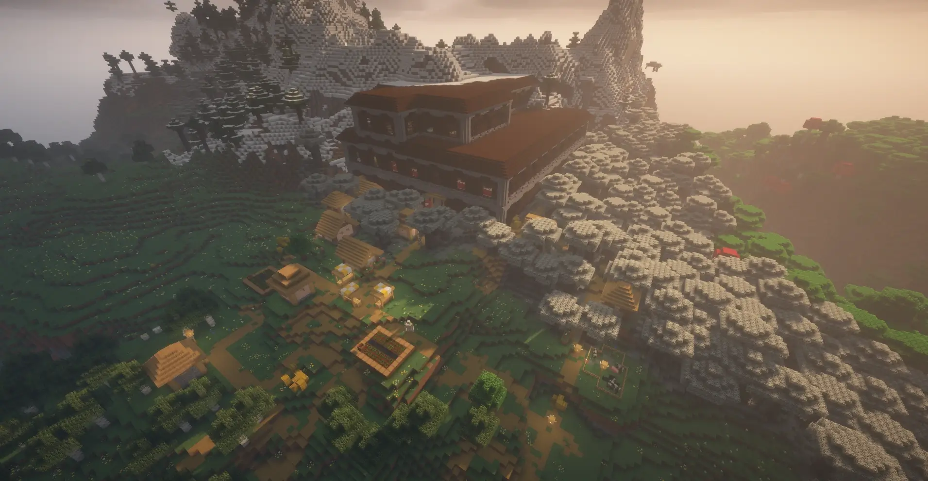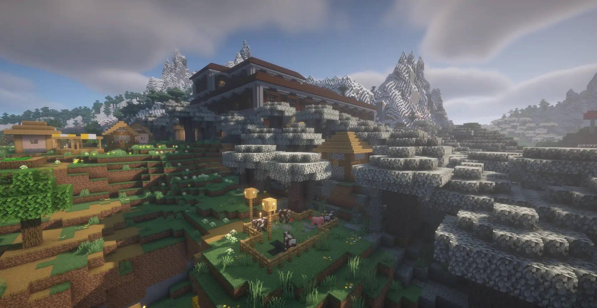 Minecraft seed with a Woodland Mansion right beside a village, surrounded by mountains and perfect for an epic survival start.