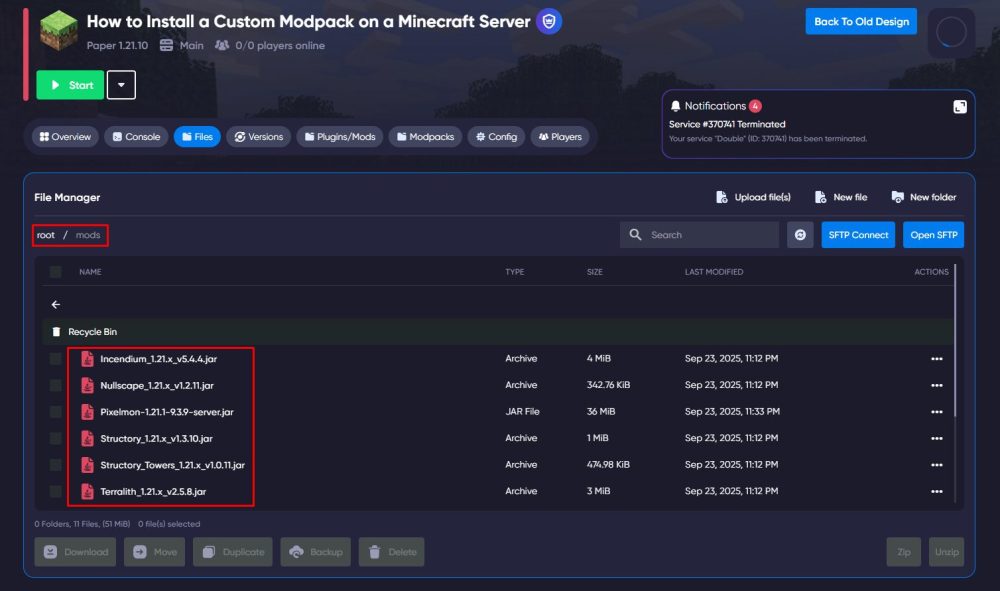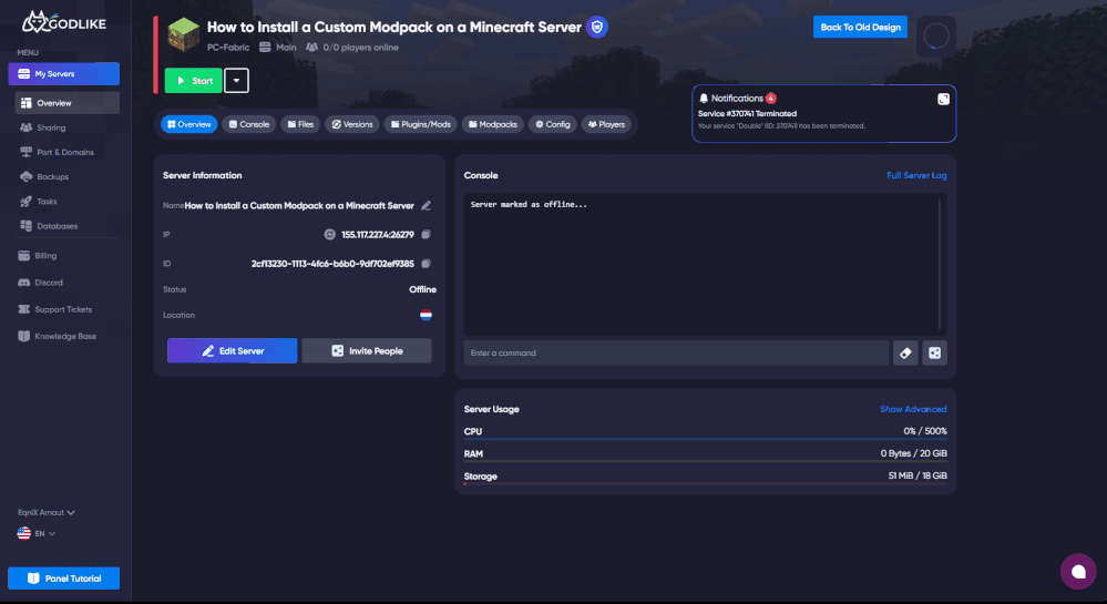 Після того, як модпак запрацює локально, переконайтеся, що ваш сервер має достатньо RAM і потужності процесора, щоб впоратися з ним. Великі модифікації часто вимагають більше ресурсів - як для безперебійної роботи, так і для запобігання збоїв під час генерації світу. Якщо ви не впевнені у вимогах, перевірте загальну кількість модифікацій і подумайте про виділення додаткової пам'яті або перехід на вищий рівень сервера.